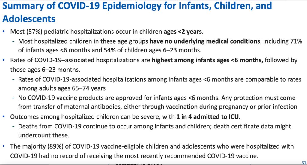 The CDC must have seen this coming and tried to ward off the restriction to only sick kids, because look at the slides CDC prepared in an attempt to convince regulators that healthy kids were also being hospitalized and dying from/with COVID, and there was no way of knowing which kids needed the vaccine. So all of them did. Of course.