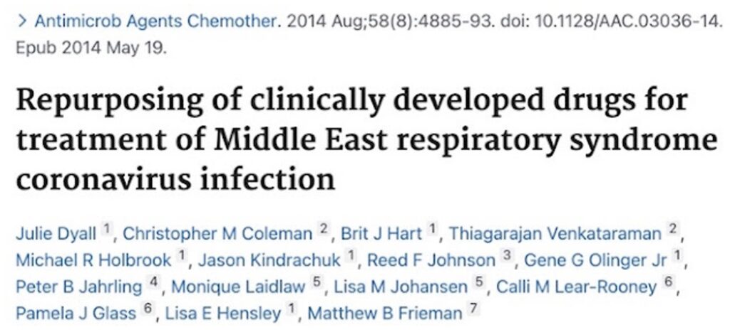 Nine years later, in 2014, scientists in Tony Fauci’s NIAID showed the same thing. Not only did chloroquine work in vitro against the MERS coronavirus, but 66 existing drugs, which could have been tested in patients as soon as the pandemic started, were also effective against SARS and MERS coronaviruses.