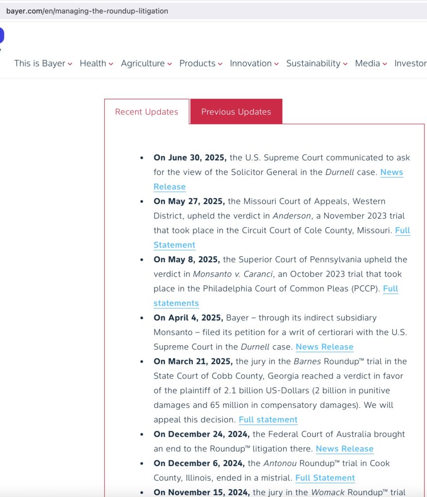 Below is Bayer’s posted list of its many efforts to forestall its liability using many methods, as well as the junk science from bought off scientists it has been notorious for using.