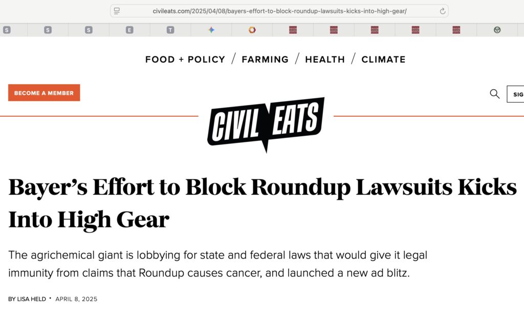 State-Level Messaging and Momentum (or Lack Thereof)On April 1, Iowans stood in front of their state capitol building in Des Moines holding letters that spelled out, “NO CANCER GAG ACT.” State Representative Megan Srinivas, a Democrat, who has been leading opposition to the bill in the legislature, stepped up to the podium.“This bill only gives corporate profits a boost,” she said. “It tells Iowans, ‘Your lives don’t matter.’ ”The bill, SF 394, passed in the Senate, although all Democrats and six Republicans voted against it. House lawmakers had an April 4 deadline to take it up in their chamber or it would be dead for the session, and the press conference at the state capitol was organized in support of that outcome. A coalition of 31 advocacy groups also sent a letter to House lawmakers, urging them to oppose the bill.At the rally, Srinivas brought up Iowa’s high and rising cancer rates, a rallying cry from last year’s battle. Srinivas linked those rates to widespread use of agricultural chemicals in the state.Bayer has been running ads, including the one on the left, that emphasize glyphosate’s safety when used as directed. Many of the Modern Ag Alliance’s ads, like the one on the right, emphasize support for farmers and don’t disclose Bayer’s involvement.In 2024, farmers sprayed glyphosate on an estimated 15.5 million acres of corn and soybeans fields across Iowa. That’s not including its use in fields sown with other crops like wheat and oats, or across lawns, golf courses, and gardens.“There’s just more exposure in Iowa,” said Dani Replogle, an attorney with Food & Water Watch.However, health agencies disagree on the carcinogenic effects of glyphosate, and cancer is a complicated disease with many causes. It’s difficult to tease out how much of an impact agricultural chemical use has on cancer rates overall or to distinguish the impacts of one chemical from another when so many are used across the landscape.Roundup is less toxic compared to many other approved pesticides but is used at a scale that is exponentially greater than other chemicals, so its association with non-Hodgkins’ lymphoma risk has had a much broader impact. In 2019, for example, U.S. farmers used about 275 million pounds of glyphosate. Atrazine was the second most widely used herbicide, at 75 million pounds.Roundup is also more widely used by individuals outside of agriculture, including landscapers and gardeners. (Bayer is now in the process of taking glyphosate out of home use Roundup products as another prong in the plan to end lawsuits.) However, advocates say it’s important to note that the pesticide immunity bills won’t just apply to Roundup, they’ll apply to any pesticide.In support of the pesticide immunity bill, Bayer sent four lobbyists to the Iowa state house and forged alliances with powerful agricultural groups. The Agribusiness Association of Iowa, Iowa Soybean Association, and Iowa Corn Growers Association are all partners in the Modern Ag Alliance and registered lobbyists to support the bill.In an effort to pass state bills, the company has focused on a public messaging campaign that included ads on television, news sites, and social media. In the first three months of the year, the Modern Ag Alliance spent about $171,000 on Meta ads alone, $21,800 of that targeted to Iowa.Some of the ads go directly to a page on the Modern Ag Alliance website where one can click on a state and send a pre-written letter to lawmakers supporting a specific bill. In Iowa, the website reports that more than 600 individuals have done so. Meta only requires companies to report spending on political ads, so the $171,000 does not include spending on a deluge of Bayer ads on glyphosate that have been flooding this reporter’s Facebook, Instagram, and LinkedIn feeds, for example, ever since reporting began for this story.The political ads cover a range of messages: Some draw unsubstantiated connections between glyphosate litigation and food prices, set up Roundup lawsuits as a battle between trial lawyers and farmers, and claim the research that links Roundup to cancer is from a “discredited foreign study.” But many of Bayer’s larger set of ads simply hammer away at a simple message: Glyphosate is safe, farmers need it, and if these bills don’t pass, it might not be available anymore.The agrichemical giant first began writing and lobbying for the passage of “pesticide immunity” laws in a handful of states last year.“They’re promoting this idea that farmers need access to glyphosate to grow corn and soybeans in Iowa, and that’s, of course, not what the bill’s about,” Food & Water Watch’s Breon said. “Glyphosate is not going anywhere. This is just about their bottom line and their profits that they’re protecting.”Civil Eats sent questions to Bayer asking specifically about whether the company would stop making glyphosate but the company’s representative did not send answers by press time.Farmers, Breon noted, are among those most often exposed to agricultural chemicals, who might want to retain their right to sue in case at some point they are diagnosed with an illness and find that chemical companies knew about undisclosed risks.While the Iowa Farm Bureau lobbied for the bill, the Iowa Farmers Union lobbied against it, declaring in a statement that farmers should be able to seek relief if they’re harmed by a chemical and that “Iowa law should protect our farmers and our communities instead of pesticide companies.”In Idaho, Jonathan Oppenheimer, the government relations director for the Idaho Conservation League, which led opposition to Idaho’s pesticide immunity bill, said the one message he saw building support for the bills was the idea that Bayer would stop making Roundup if states did not grant them immunity and litigation continued. In his state, the Modern Ag Alliance spent more than $20,000 on targeted Meta ads and close to 700 pe