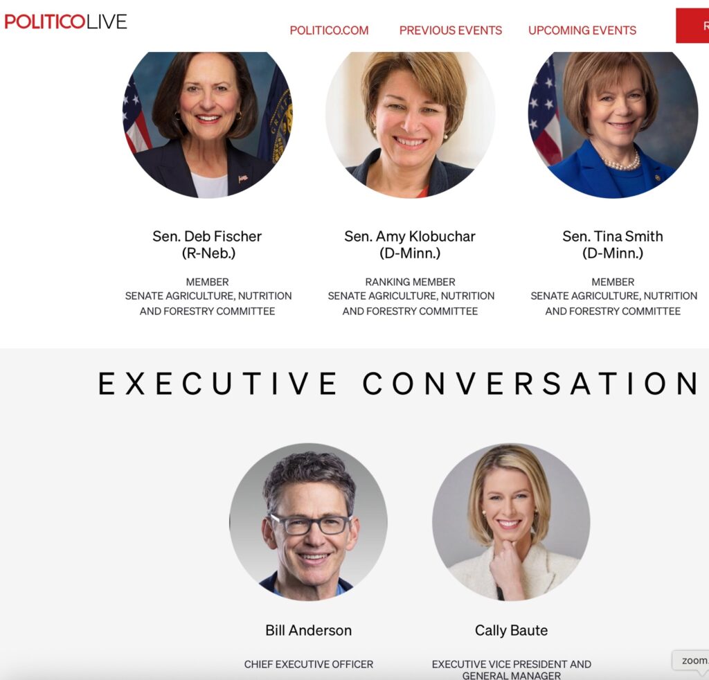 However, this may not accurately reflect how the vote will go in the full Appropriations committee and in the full House and Senate. Why? Because Bayer CEO Bill Anderson has bragged about his bipartisan support. Bayer sponsored a Politico event in March with the ranking member of the Senate Agriculture Committee, Amy Klobuchar (D-MN) and two other members of the Committee, Senators Tina Smith (D, MN) and Deb Fischer (R, NE).