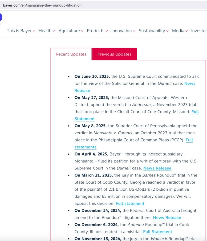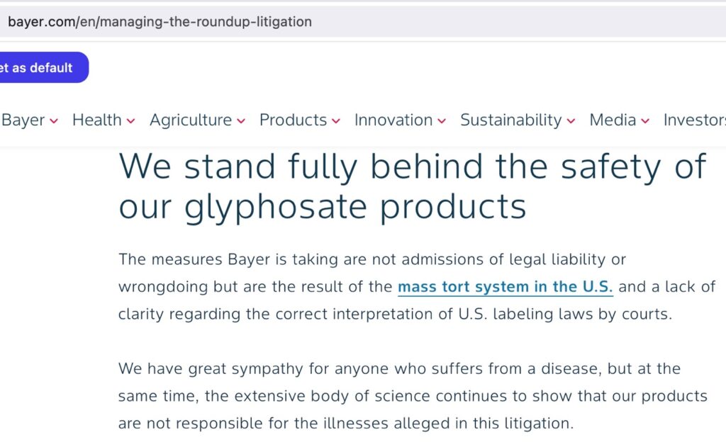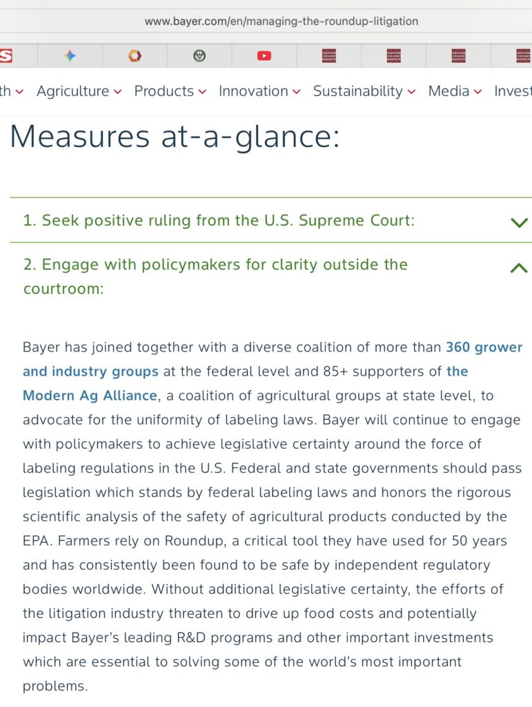When even Bayer’s own website, and the CEO of Bayer told his shareholders that this was what Bayer would be seeking (a solution to its tort liability) it is the height of brazenness for Congressmembers to try and deny it. Clearly, they fear being caught voting for a measure that can only harm their constituents. They feel, or have been told, that it is safest to deny they knew what they were voting for. Don’t let this fool you! Put their feet to the fire if members’ offices try and tell you differently.