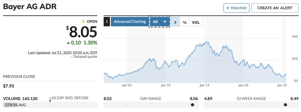 Bayer’s stock has been dropping ever since it bought Monsanto. Eventually, about 177,000 potential lawsuits appeared. About 67,000 thousand have settled, at a cost to Bayer of $11 Billion dollars. Bayer’s current share price is $8.05, less than a third of its value before the Monsanto purchase.