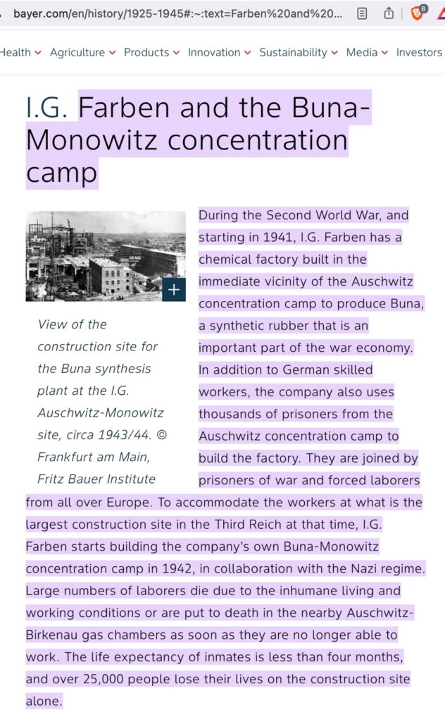 Bayer is no stranger to risk and controversy. During World War 2, as part of I.G. Farben’s network it ran its own concentration camp to produce war materials, admitting on its website to working 25,000 slave laborers to death.