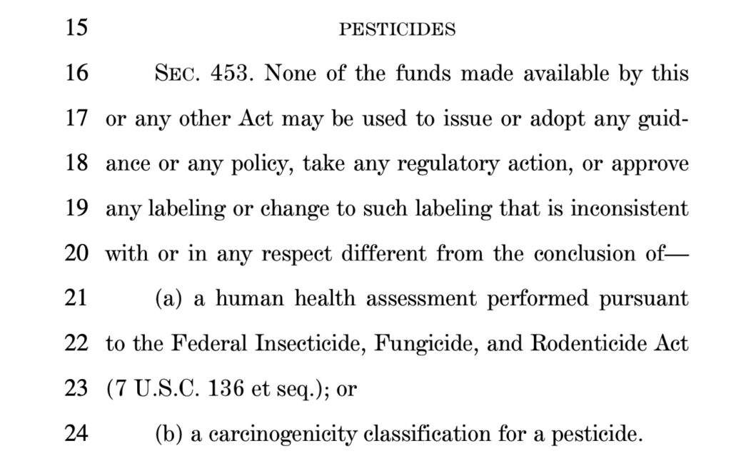 In other words, the EPA’s old but existing determination that glyphosate is safe, based primarily on Monsanto-supplied science, while failing to consider a large body of independent science, will not be allowed to be challenged going forward by other agencies, because the rider blocks all funding for timely label updates or other safety recommendations–throughout the federal government. Specifically, other agencies could be de facto banned from spending money studying toxicity issues that could lead to label changes.