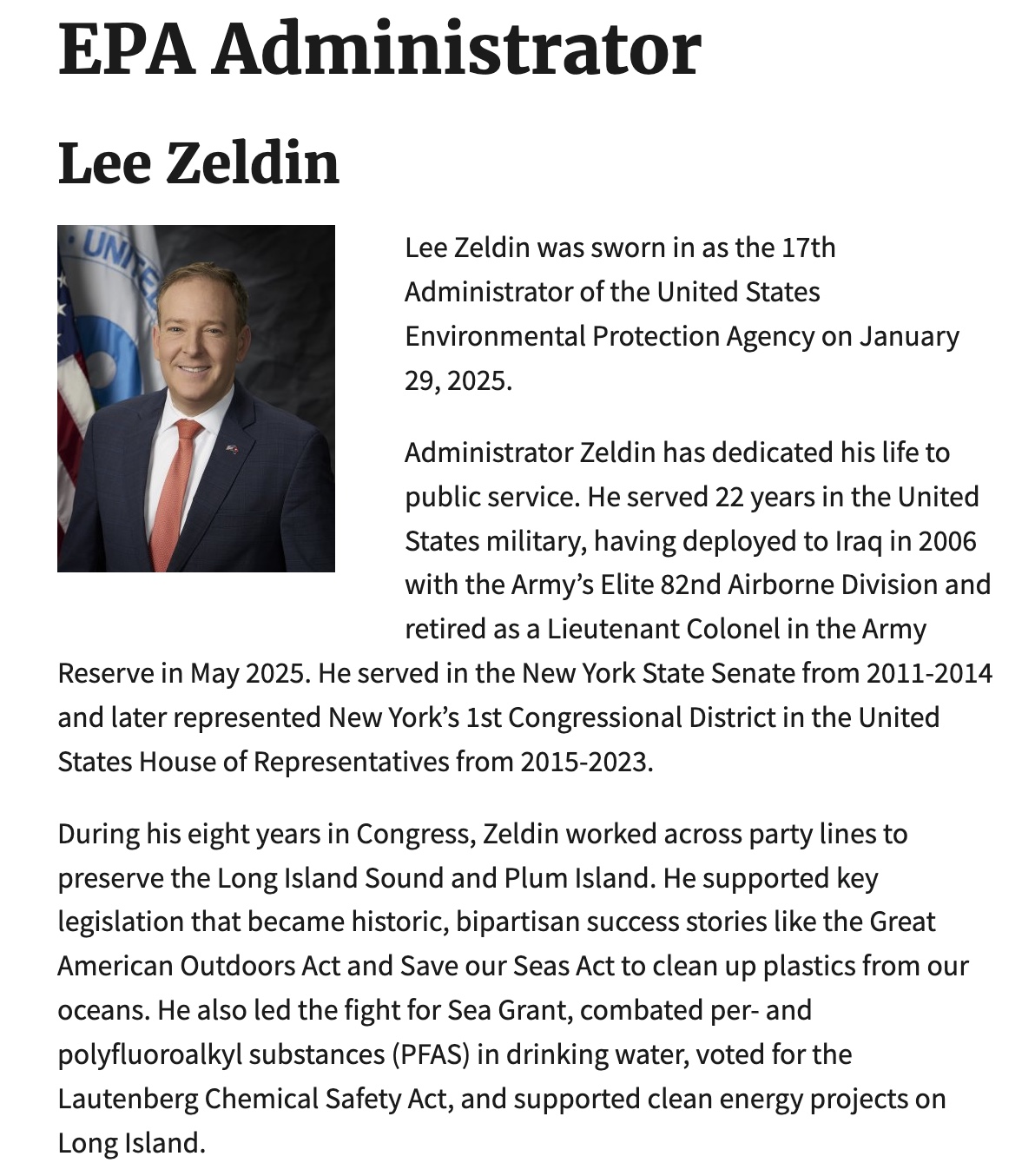 Here is Mr. Zeldin when in Congress, according to his EPA bio: a zealot for getting rid of PFAS and pollution. Mr. Environmentalist.