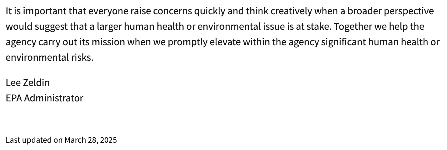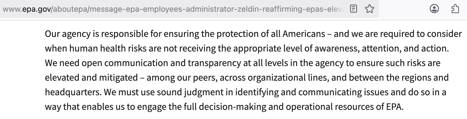 Sounds great. Best available science. Transparency. Clean up and revitalize contaminated areas. And Zeldin told his EPA employees in March not to hold back. If there is an important health risk, we have a process to bring it forward quickly.
