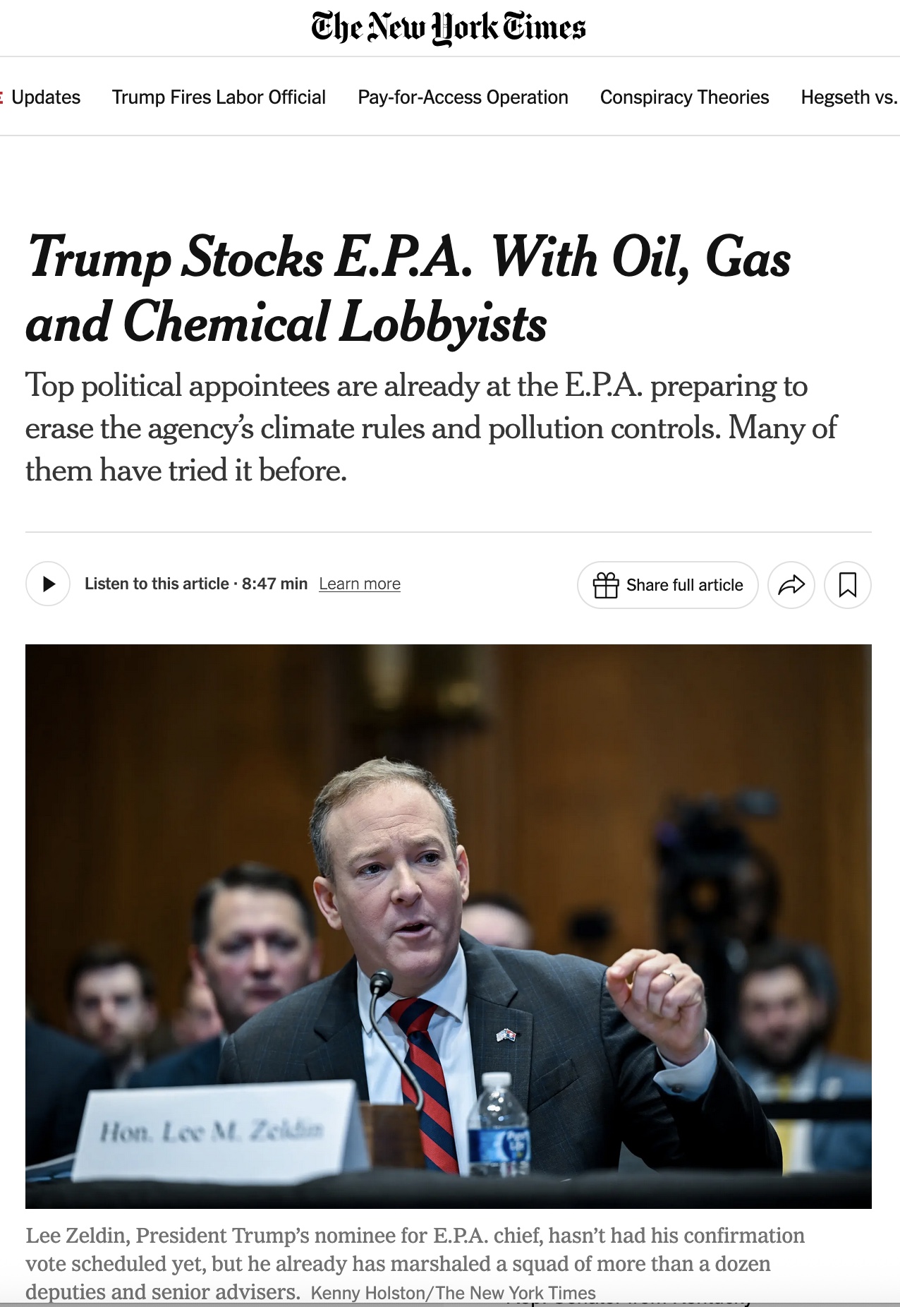 Let’s look at some of the officials handpicked to deregulate the EPA. Sorry, but this is from the NYT. Ignore the spin and pay attention to the facts. Not encouraging, to say the least.