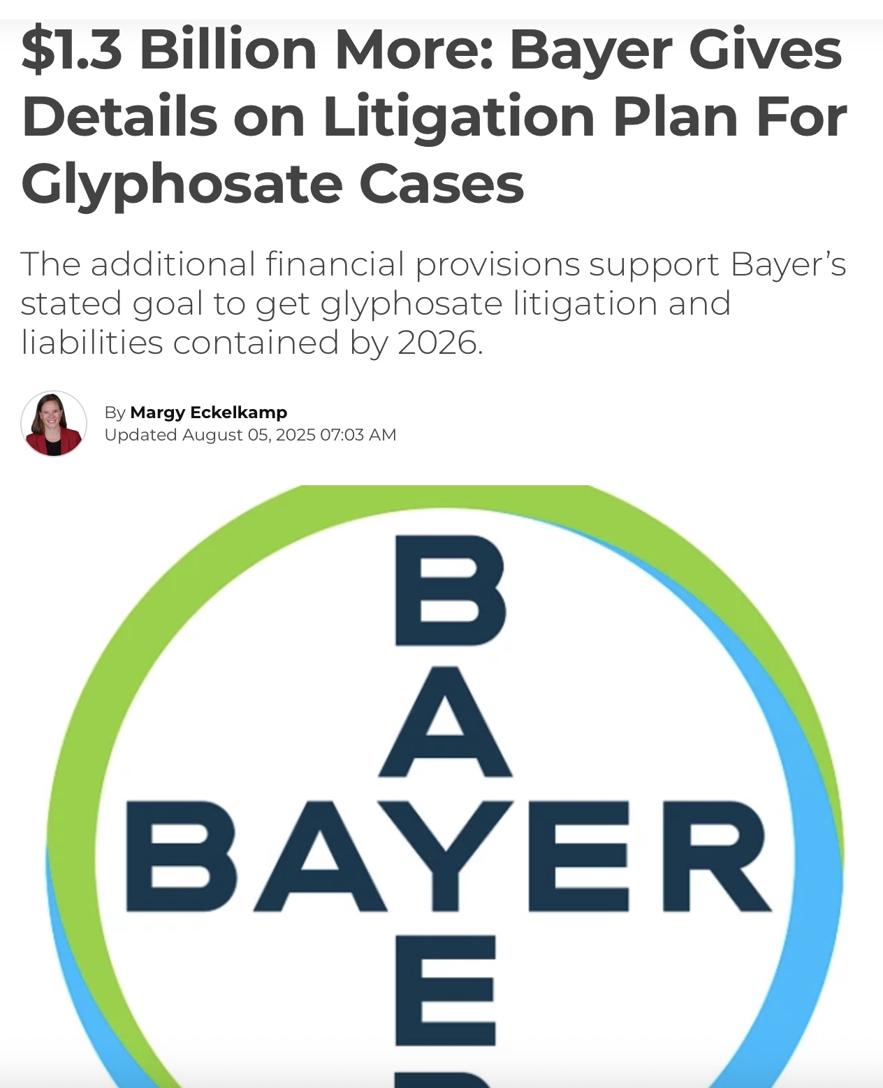 Bayer doubles down. Allots another $1.3 Billion to its war chest to get its glyphosate liability off its chest by end 2026