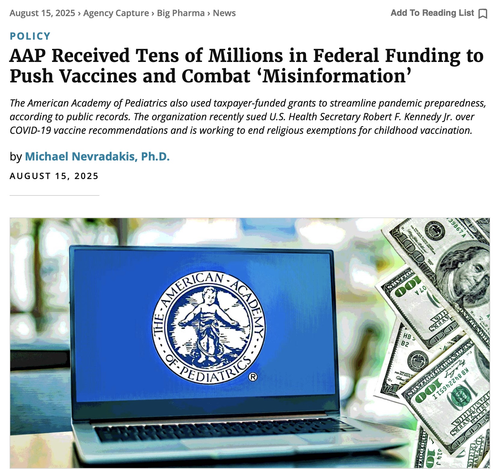 American Academy of Pediatrics received $35 million from taxpayers in 2023, plus $$ funds from Pharma–no wonder it demands vaccine mandates in schools and is suing Sec. Kennedy