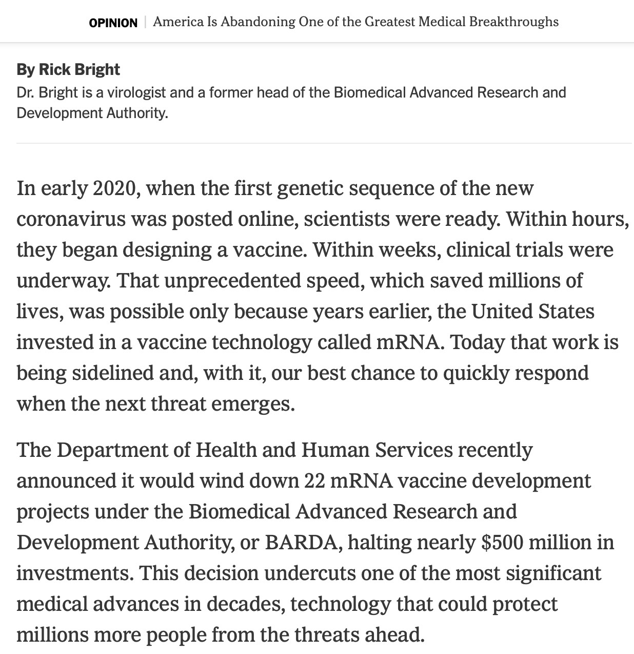 Rick Bright tells us 7 different times how fast it is to produce mRNA vaccines. He omits the negative efficacy part, the thromboses, myocarditis, and so many more complications. Another NYT masterpiece of deception. How much did it cost to get this into the Times? And of course he features the “we need it for national security” spin. My comments are interspersed.