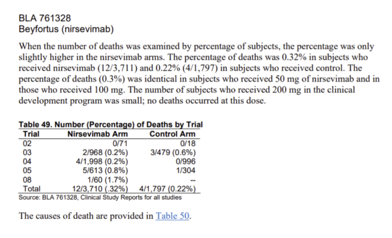 Trial 03: 2 deaths among 968 nirsevimab recipients; 3 among 479 controls.