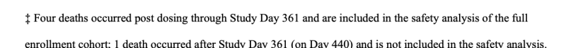 That exclusion does not align with the trial’s own protocol, which prespecified safety follow-up of approximately 510 days after dosing. By that definition, a death occurring on Day 440 falls inside the intended safety window.