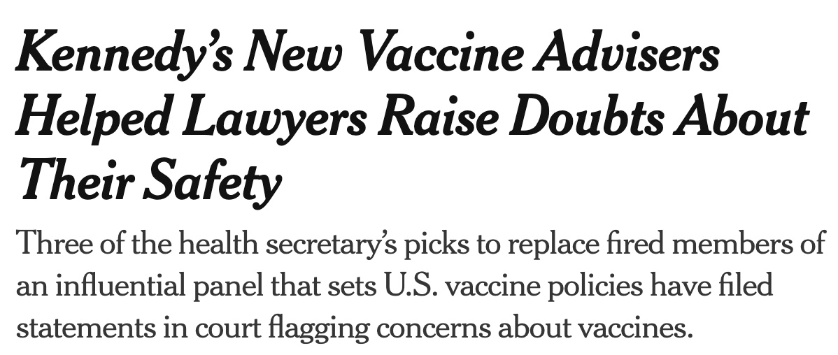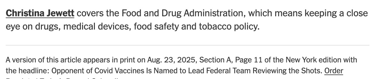 The same reporter who wrote this article, Christina Jewett, worked very hard to try to drum up financial conflicts of interest for the new ACIP members in a recent NYT article she cowrote, but had trouble making the case. Funny how her assiduous search for conflicts of interest in new ACIP members (Belongia is a former ACIP member) disappeared when she decided to use Belongia as a source. Here is how that article was framed: