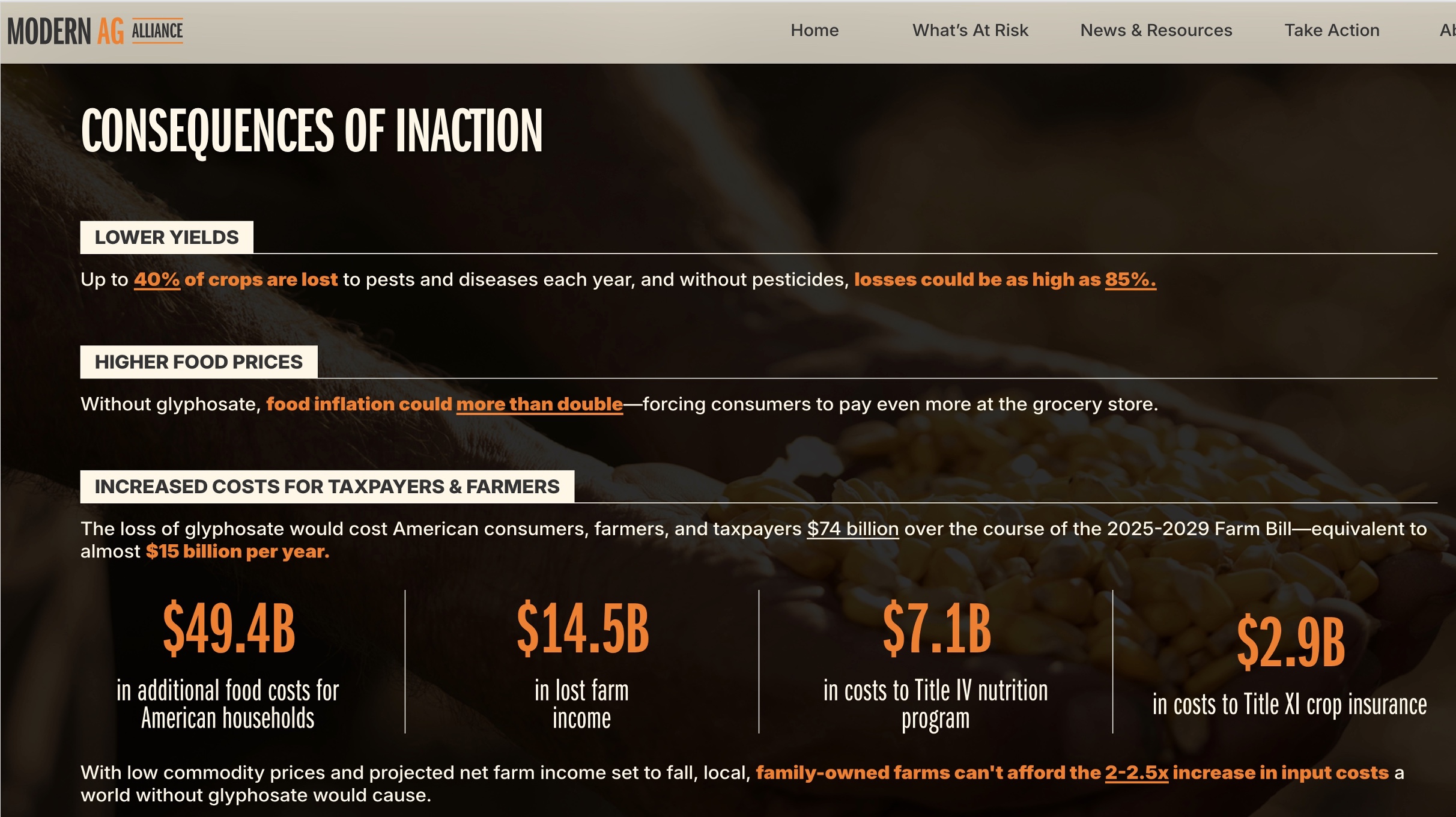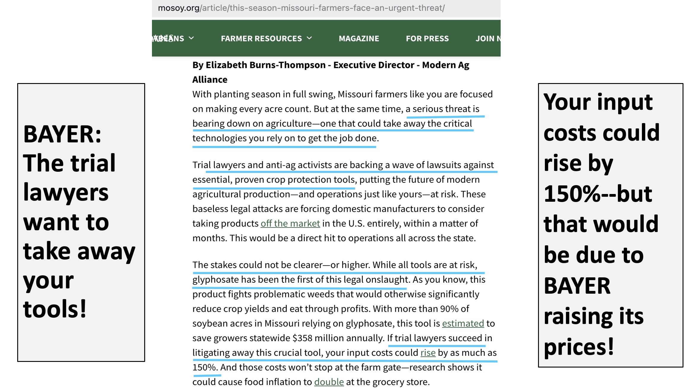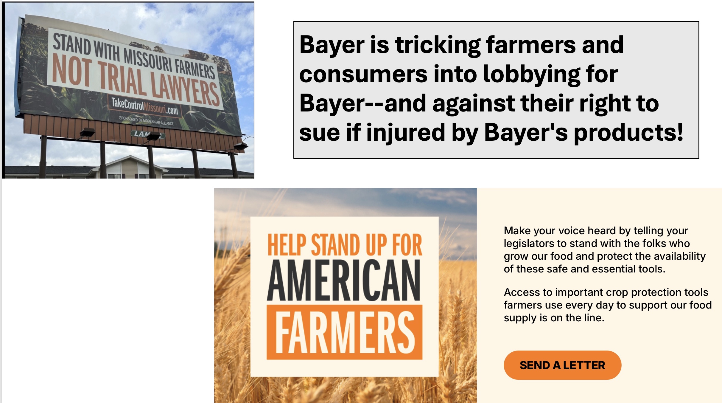 Bayer formed an organization called Modern Ag Alliance with most other pesticide manufacturers. Knowing they could not get anyone who understood the issue to support removing the industry’s pesticide liability, they crafted fake cover stories that were intended to pull the wool over our eyes, and get us to lobby on Bayer’s behalf! All via the Modern Ag Alliance, which is their new PR entity.