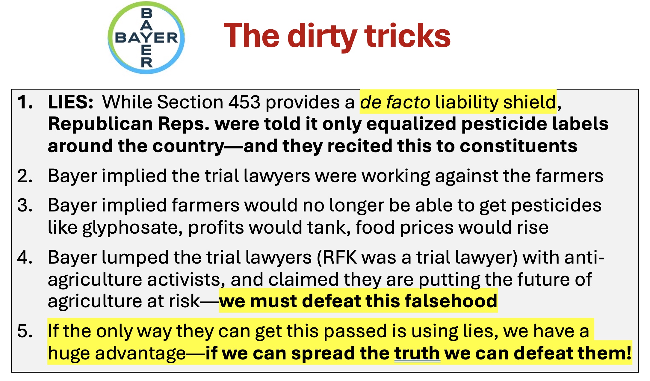 Bayer and the pesticide industry are lying about the liability shield they seek. They are begging farmers to call Congress because we are trying to take away their chemicals. Except, we are NOT!