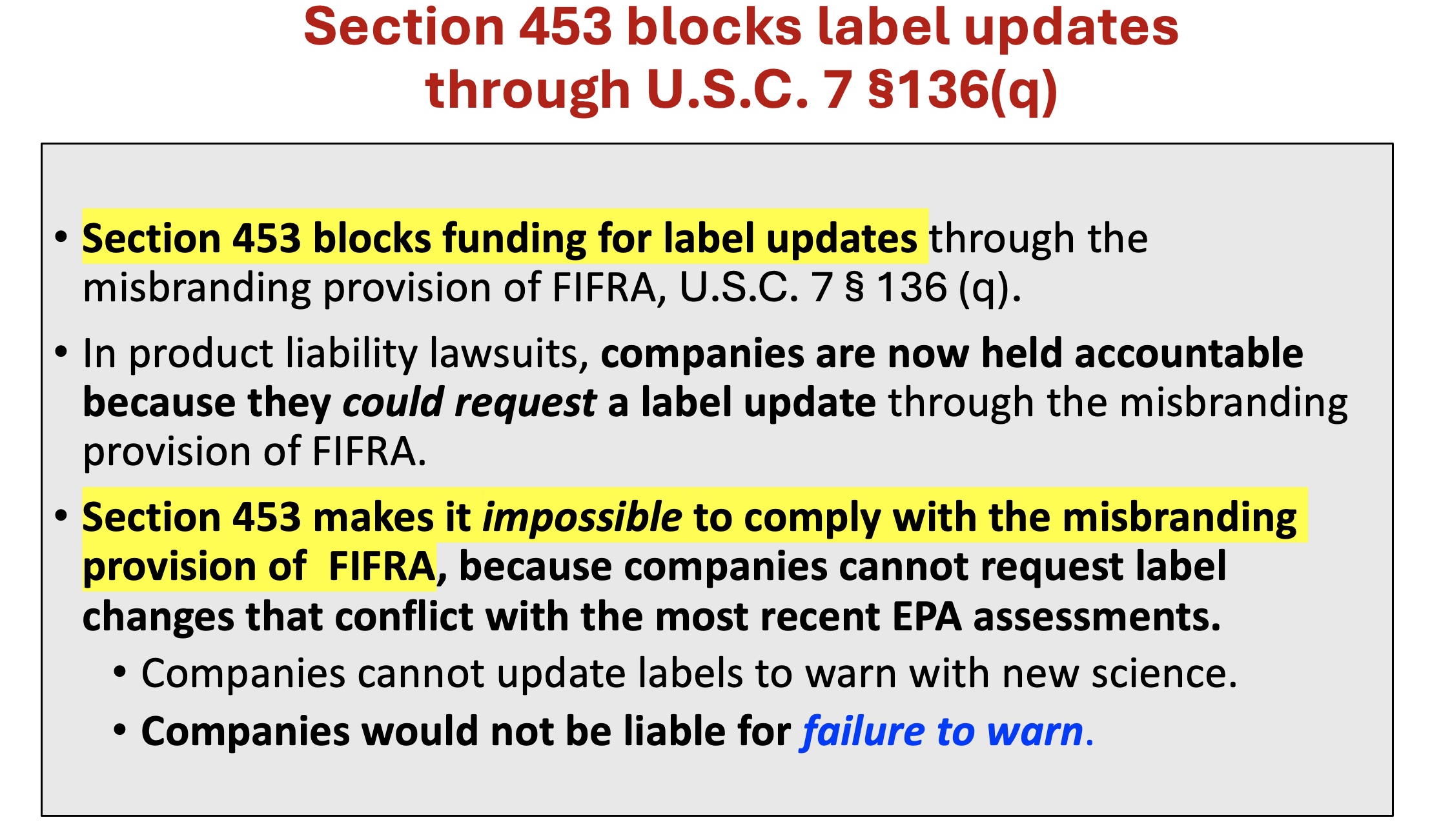 The bill is only 9 lines long, but it refers to the pesticides regulation law FIFRA, which is over 100 pages long and that Bayer hopes no one will read.