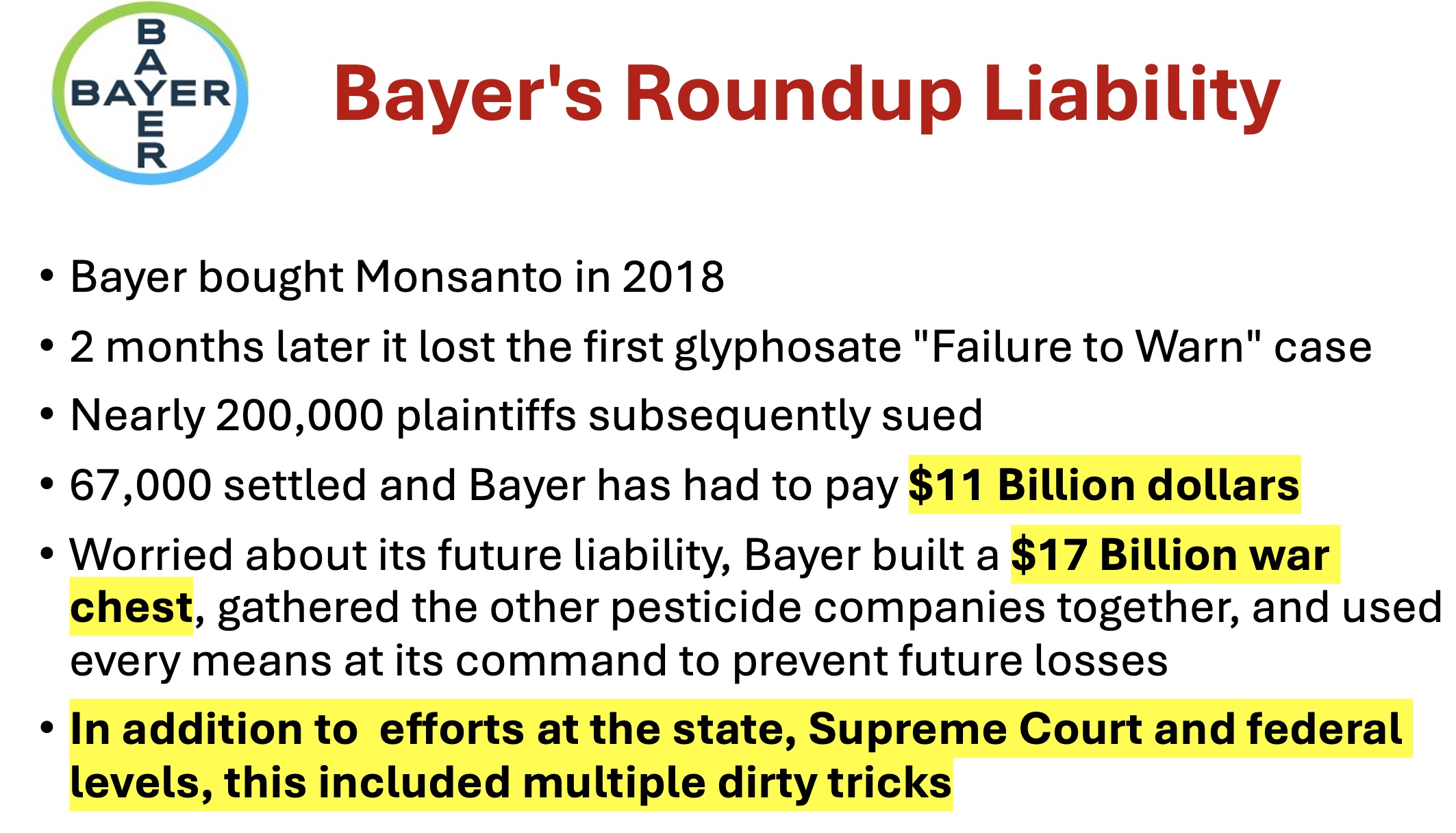 Everyone in the industry knows this is all about glyphosate liability and the 110,000 or more pending cases, mostly in people with non-Hodgkin’s Lymphoma. Bayer already spent $11 Billion on resolving the first 67,000 cases, their stock price has dropped by 2/3 since they bought Monsanto, and if they can’t make the liability go away, the pending cases could wind up bankrupting the company.