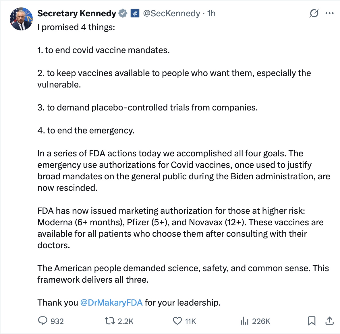 COVID vaccines remain on the childhood schedule, albeit with provisos. I think they need to be removed from the childhood schedule completely, and then the liability shield for the manufacturers will go away. Checking on this. Vaccines placed on the childhood schedule will get liability protection for the mfrs after a 75 cent excise tax is placed on each dose, and an announcement issued in the Federal Register. IF that has already been accomplished for the licensed COVID vaccines, then they will fall under the Vaccine Injury Compensation Program and are still awarded liability protection. Those that were under EUA and are unlicensed will have lost their liability protection.