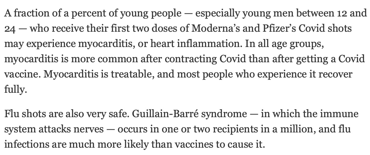 Myocarditis is hardly treatable, and a considerable percentage appear to have permanent scars and long-lasting inflammation. But the Gray Lady never lets the facts get in the way of a good story.