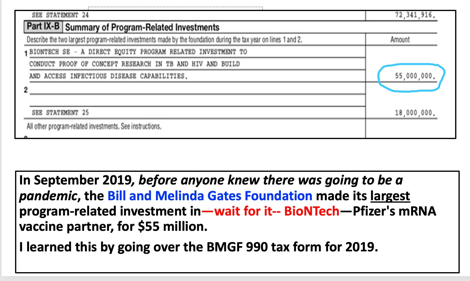 Below is part of a page from the BMGF 990 tax form for 2019, which reveals that the largest program-related investment the fund made was in the company BioNTech in Germany, which had never brought a product to market at that point. Somehow the BMGF investment geniuses knew in September 2019 that BioNTech might be a very good investment. You can verify this online. I discovered it years ago, during the pandemic.