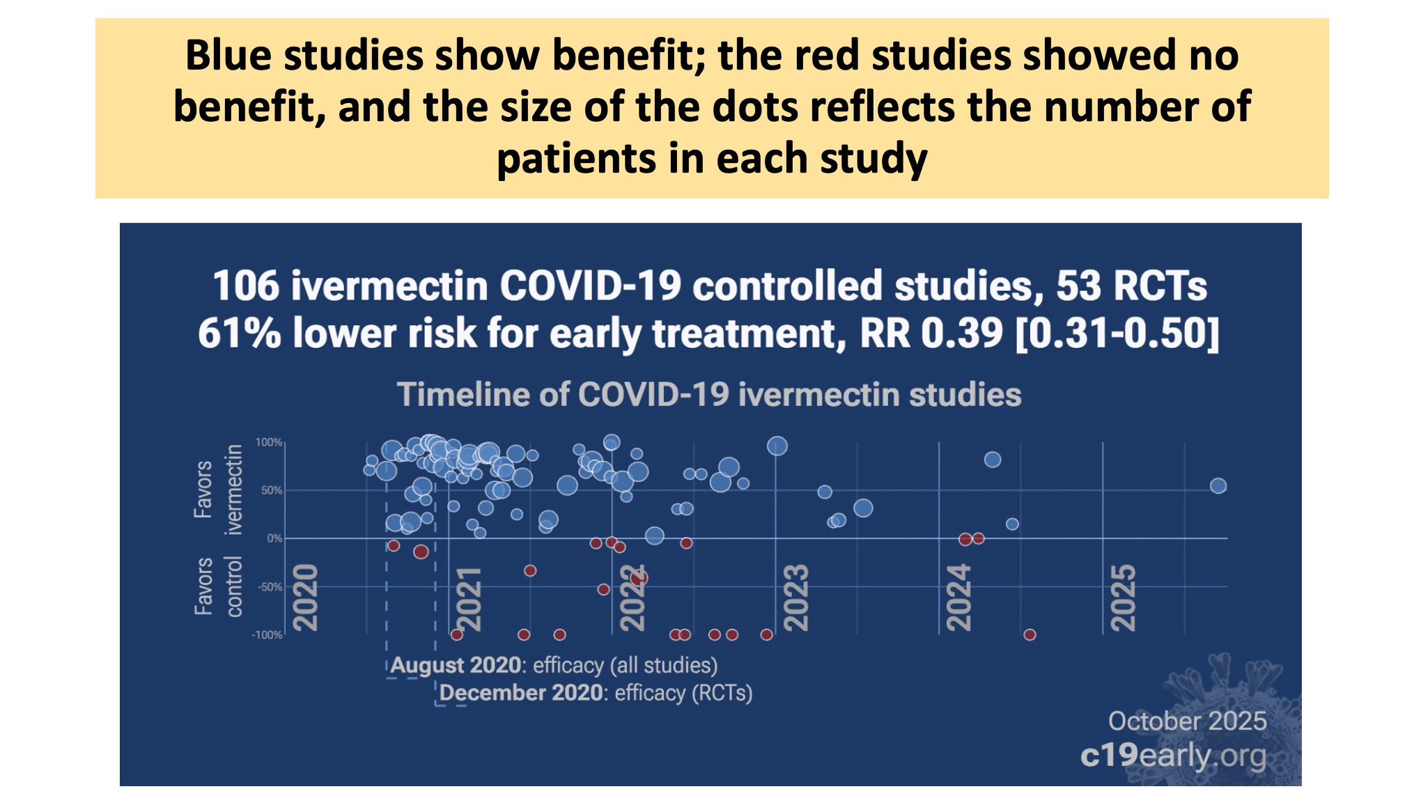 The graph below has a colored bubble representing each study. The middle of the graph’s horizontal line represents studies that showed no benefit from either the placebo or IVM. As a study is located farther from the central line, it shows more and more benefit from the placebo (red bubbles) or from IVM (blue bubbles). The larger the bubble, the more patients were enrolled in that study. Roughly 75-80% of the studies showed IVM beneficial for COVID.