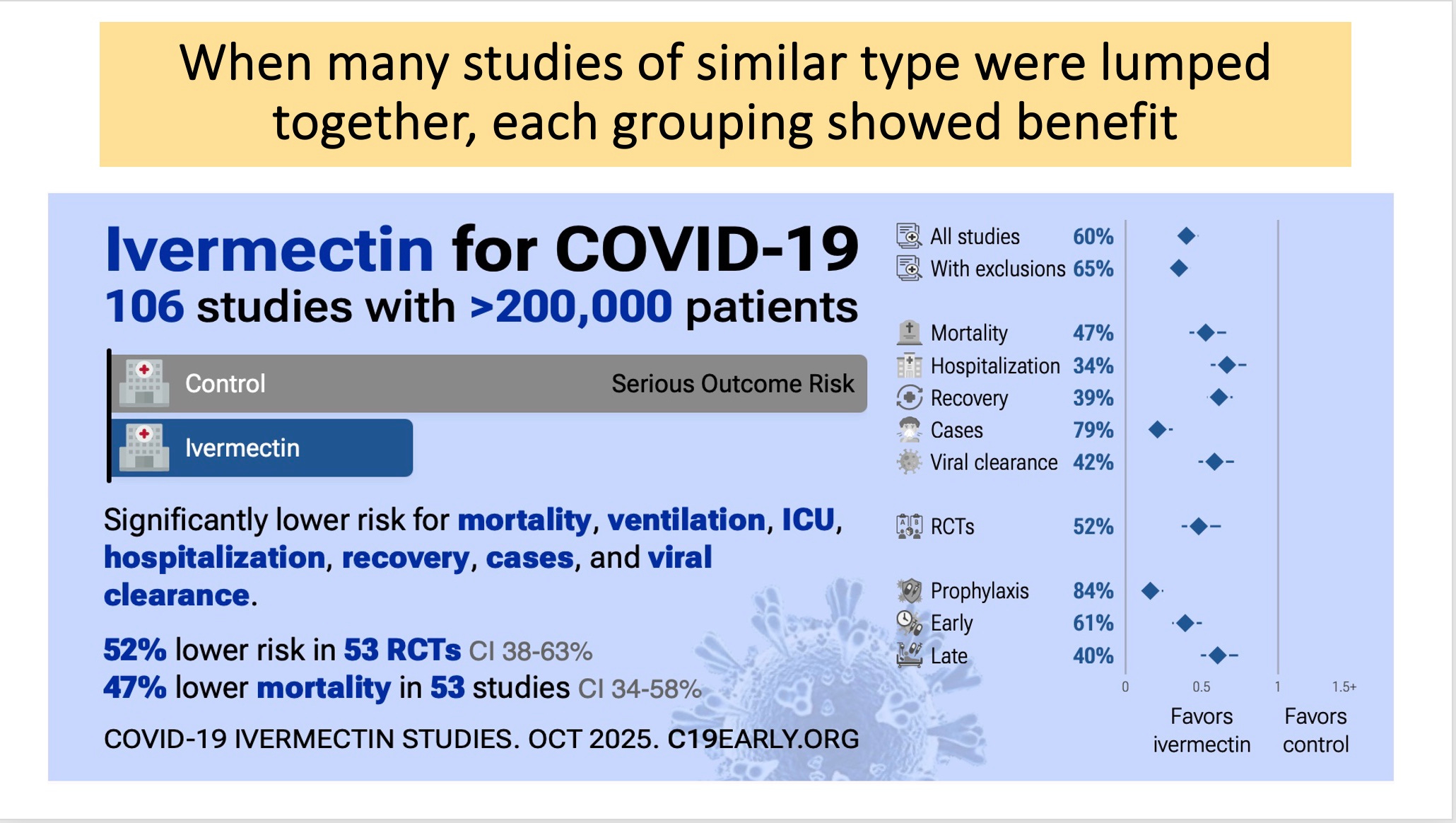 This ivermectin graph also groups similar studies together. As with HCQ, providing the drug early or as prophylaxis gives the best results, but ivermectin continues to have efficacy even when used late.