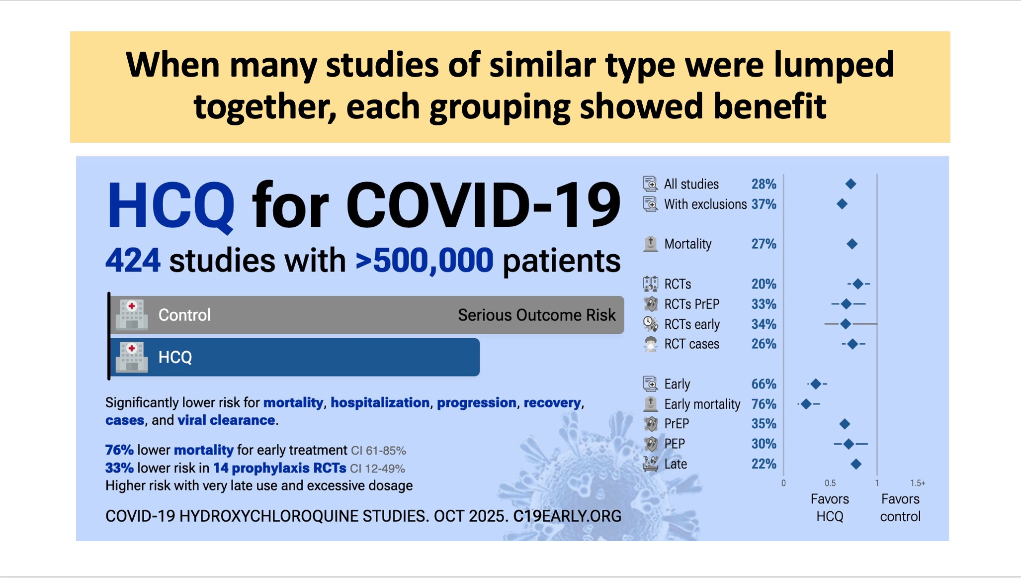 This slide is updated to show the 424 studies evaluating HCQ for COVID. When given early, HCQ worked wonderfully. When given late it worked poorly, diluting the overall effect. Is this why public health officials argued against early treatment in general? COVID is the only disease doctors advised to treat late but not early, which is counterintuitive and absolutely wrong.