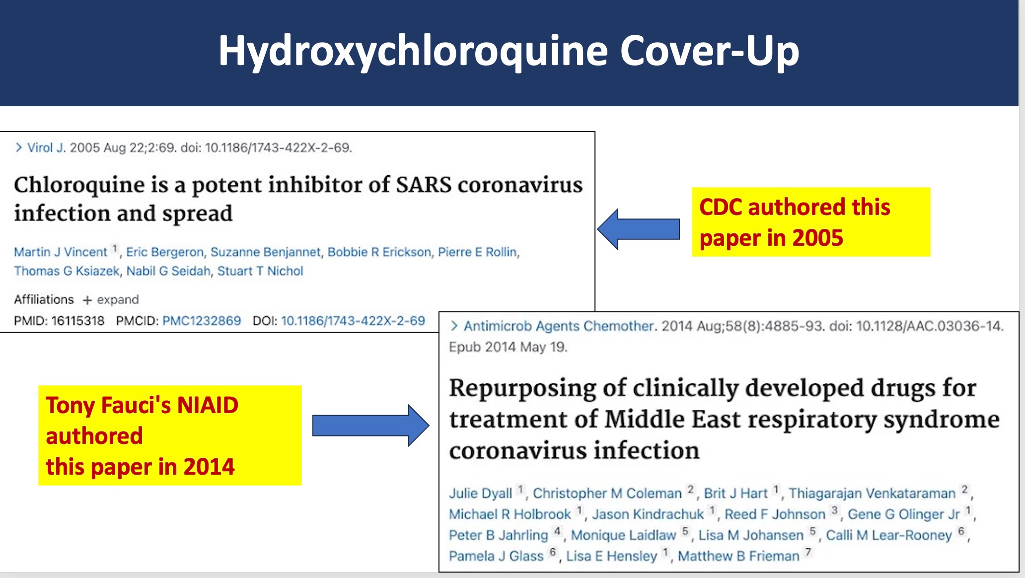 This one shows the 2 published studies from CDC and NIH that revealed the chloroquine drugs killed the SARS-1 and MERS coronaviruses—15 and 6 years before COVID— that were suppressed. I have also sometimes shown 2 studies from scientists in Belgium and Netherlands that showed the same thing, also about 6 years before COVID.