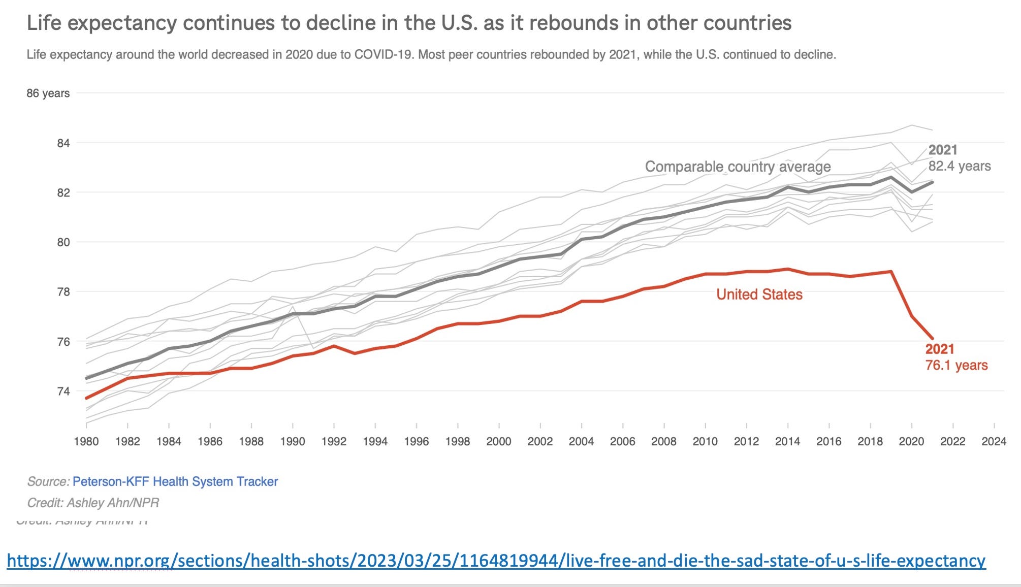 The slide below uses CDC mortality data (the red line) along with data from comparable nations in gray. As our food quality worsened and our medical care became more expensive, our life expectancy got worse relative to our peer nations. By 2021, nations like Japan, Switzerland and Spain were living 8 years longer than Americans. That’s something to complain about!