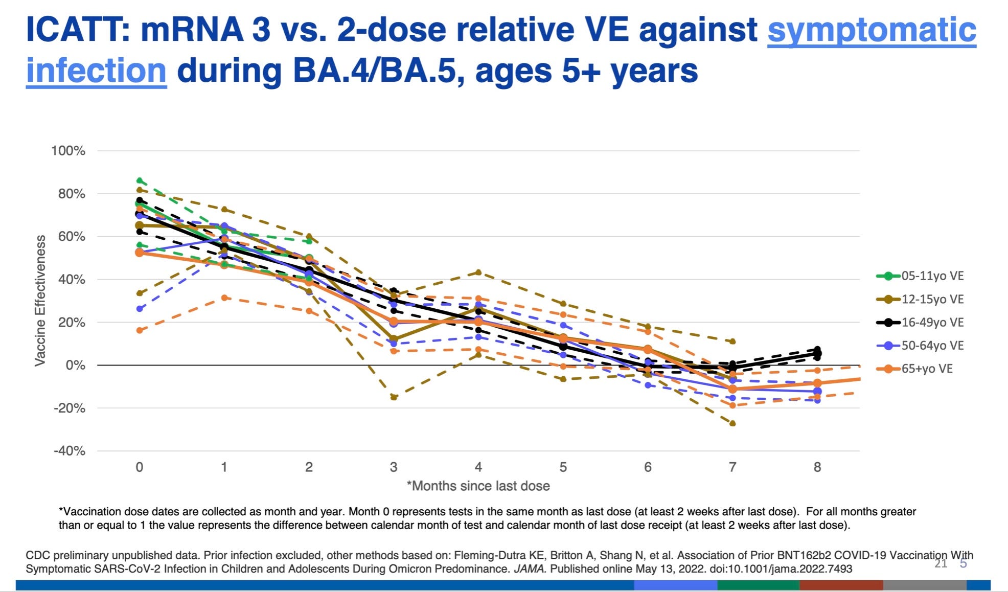 Below is an old CDC slide that has some flaws, but shows us that efficacy of the COVID vaccines for all age groups dropped to zero by about 6-7 months. After that, CDC fails to shows us what happens to efficacy, but we know from data from the UK that it get more negative—in other words, you become more and more susceptible to getting COVID.