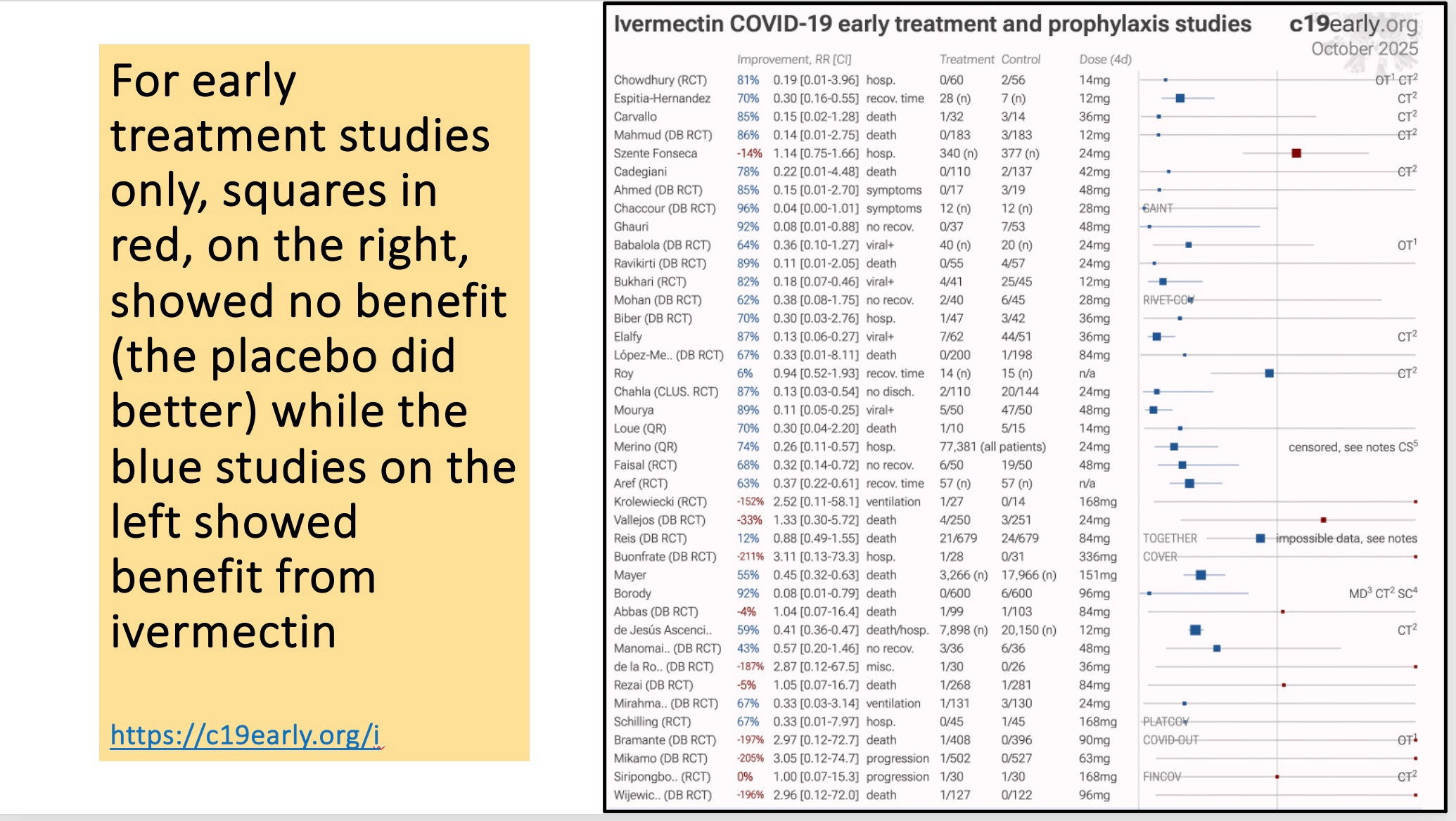 The chart below lists only the studies of early treatment or prevention. Here IVM showed the most benefit (greatest distance from the center line) and the studies that showed no benefit, in red, tended to enroll very small numbers of subjects, which is why their squares were so tiny.