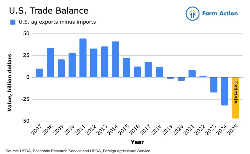 The U.S. is projected to run a $47 billion agricultural trade deficit in 2025 due to imports of essential foods.