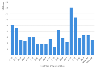 It has a permanent indefinite borrowing authority of $30 billion from the U.S. Treasury. By law, it receives an annual appropriation equal to the amount of the previous year’s net realized loss (see inset figure). This replenishes its borrowing authority from the Treasury and allows it to cover authorized expenditures that will not be recovered. Variations in its annual appropriation each year do not indicate any action by Congress to change program support but rather reflect changes in farm program payments and other discretionary uses of CCC’s authority that fluctuate based on economic circumstances and weather conditions.