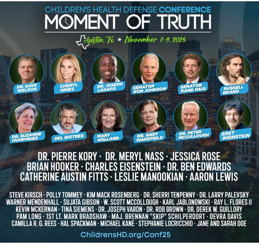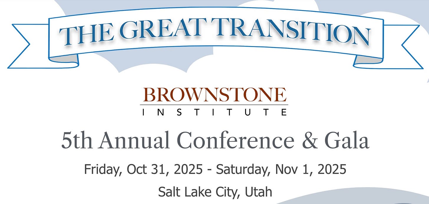 Next two weekends: the Annual Events for Brownstone Institute and Children’s Health Defense. Tickets still available (online only for CHD at $80)