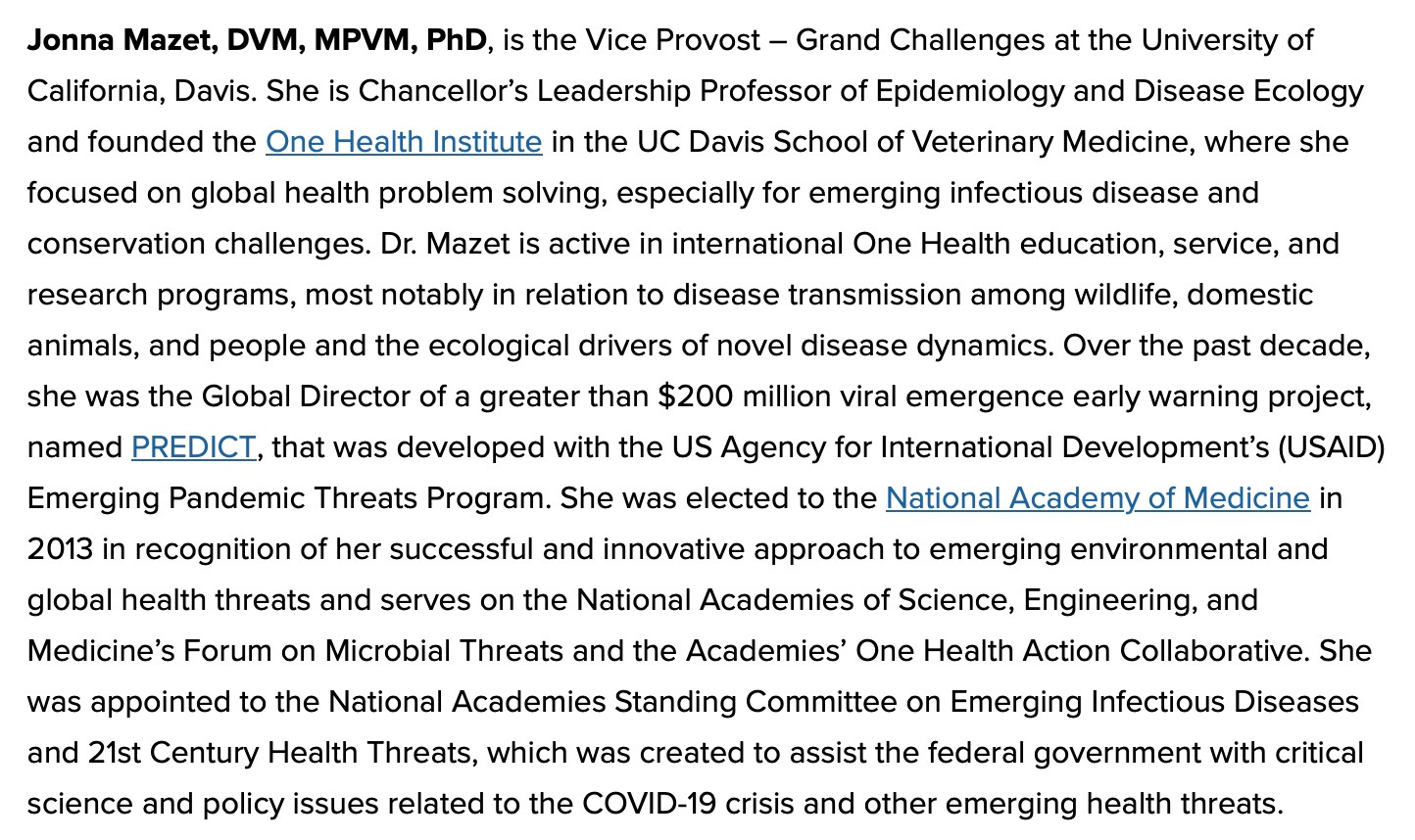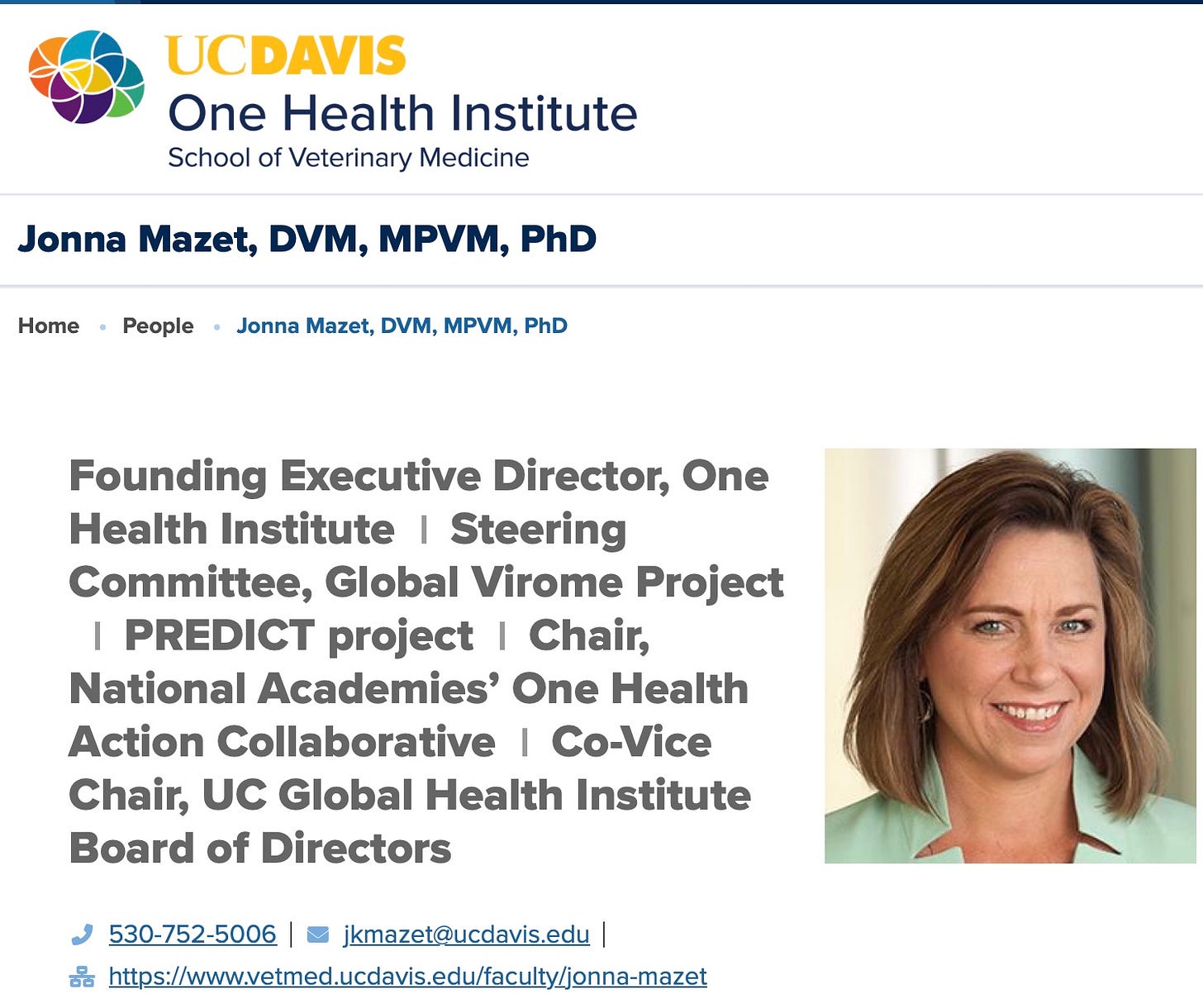 Jonna Mazet is a dirty veterinarian that must have brought a ton of money to UC Davis. She, Peter Daszak and Dennis Carroll hoped to get very rich off the Global Virome Project— a privatized early version of the Pandemic Treaty’s Pathogen Access and Benefit Sharing system. Note that others who were part of this project were Nathan Wolfe (whose company was instrumental in building Ukrainian biolabs and was financially entangled with Hunter Biden) and George Gao, then head of the Chinese CDC.