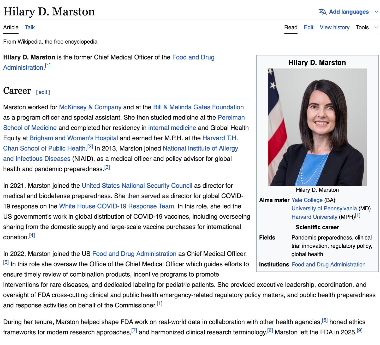 Hillary Marston, MD. What a bio! Worked for Bill Gates, McKinsey, Tony Fauci, the National Security Council. Doled out COVID vaccines. Why was she cc’d on so many early Fauci emails? Why was Fauci’s gal placed at the FDA in 2022? This girl did everything right, and got herself a brilliant career at the top of the apparatchik pyramid. Harming the entire planet.