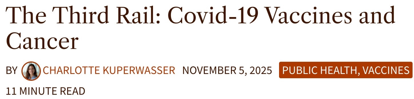 And here is a Nov. 5 Brownstone article about the relationship between COVID vaccines and cancer, written by another expert: