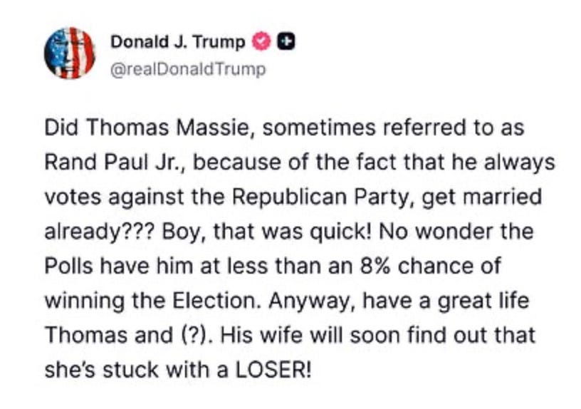 7. A gratuitously cruel thing President Trump did recently is send the following tweet or TruthSocial message. Rep. Thomas Massie, R-KY, who is perhaps the most honest, sincere and one of the most intelligent members of Congress, has called out the President on his pro-Israel stance and on the Epstein files. Massie is responsible for getting the 218 votes to release those files. You may want to thank him for that.