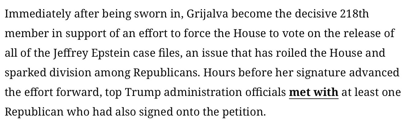 1. Jeffrey Epstein: Trump practically won the election by calling for a release of the Epstein files, then once elected, did everything in his power to block any release. He forced Kash Patel and Pam Bondi to lie that there were no files. He got Speaker Mike Johnson to refuse to seat Rep. Grijalva, a newly-elected Dem Rep from Arizona, because she pledged to be the final vote needed to release the Epstein files.