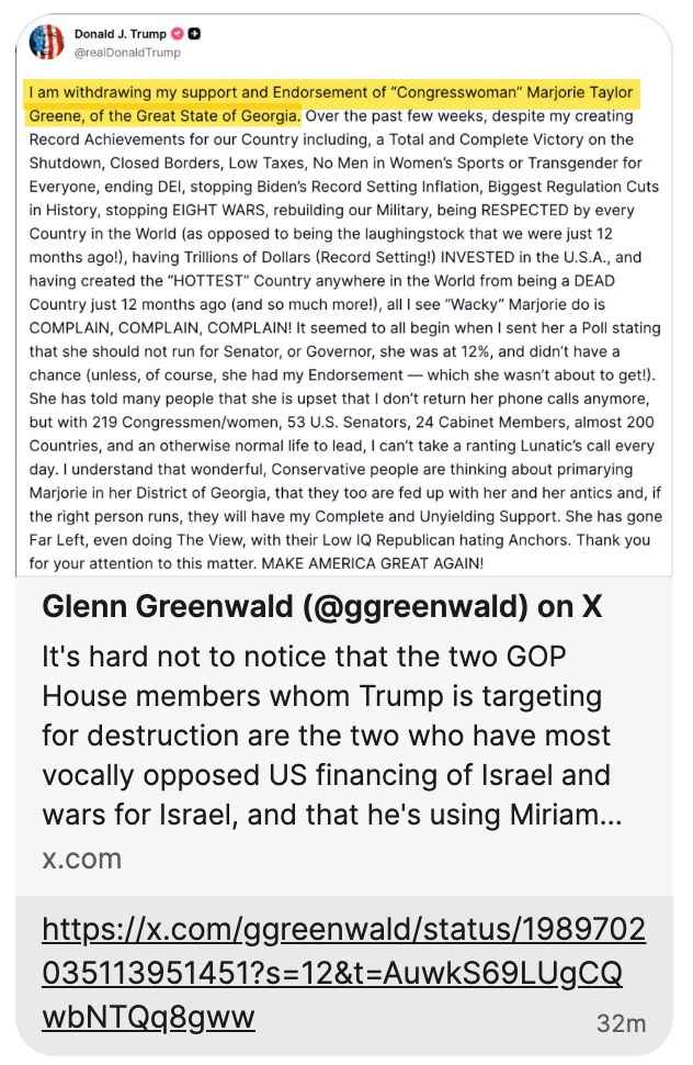 2. Trump turning on Marjorie Taylor Greene, one of his most loyal supporters in Congress, presumably because she called for a release of the Epstein files and an end to US support of Israel. So much for Trump’s loyalty. So much for Trump holding onto his most solid base in Congress—the “tea party” style members of the House. The man is actually shredding his base.