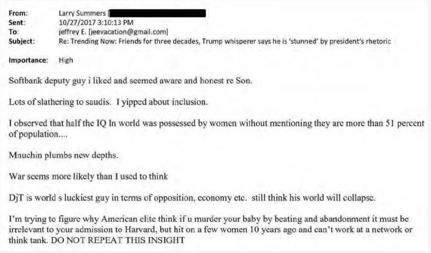 Was the sex merely a side show? Has it been used to hide the real story? What about the rest of the network that Epstein and Ghislaine worked for? Matt Stoller shows that Larry Summers, former president of Harvard, almost chair of the Fed, Secretary of the Treasury and perhaps the most influential economist and political whisperer of our era, was a close friend of Epstein. This is definitely worth a read: