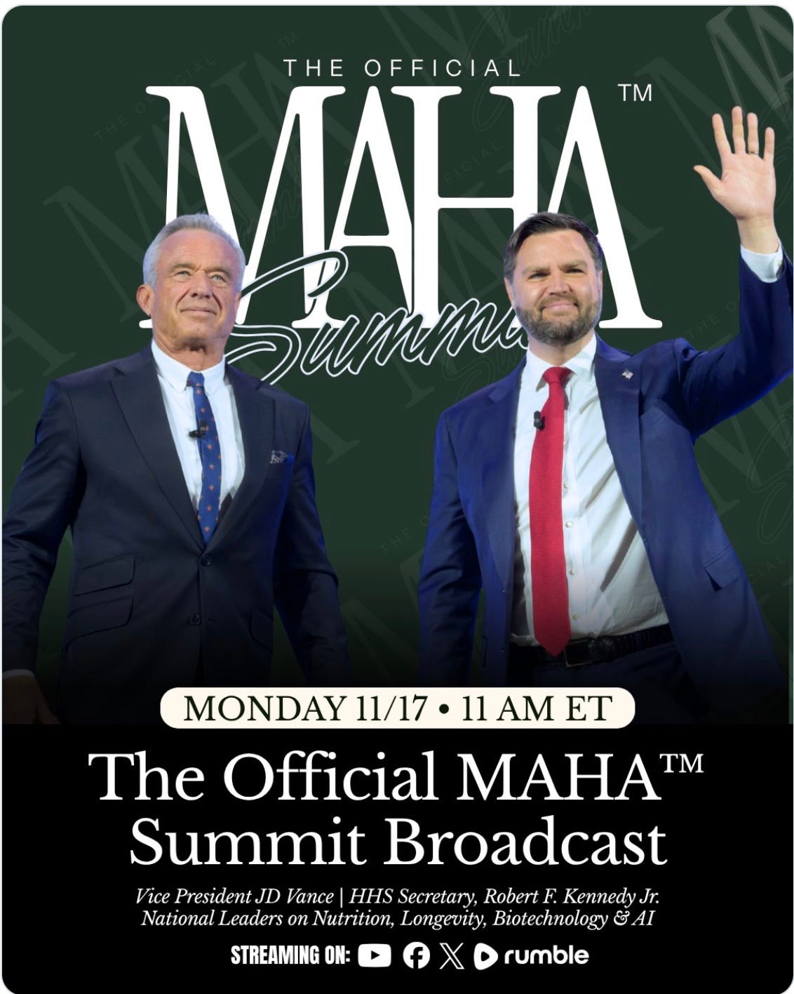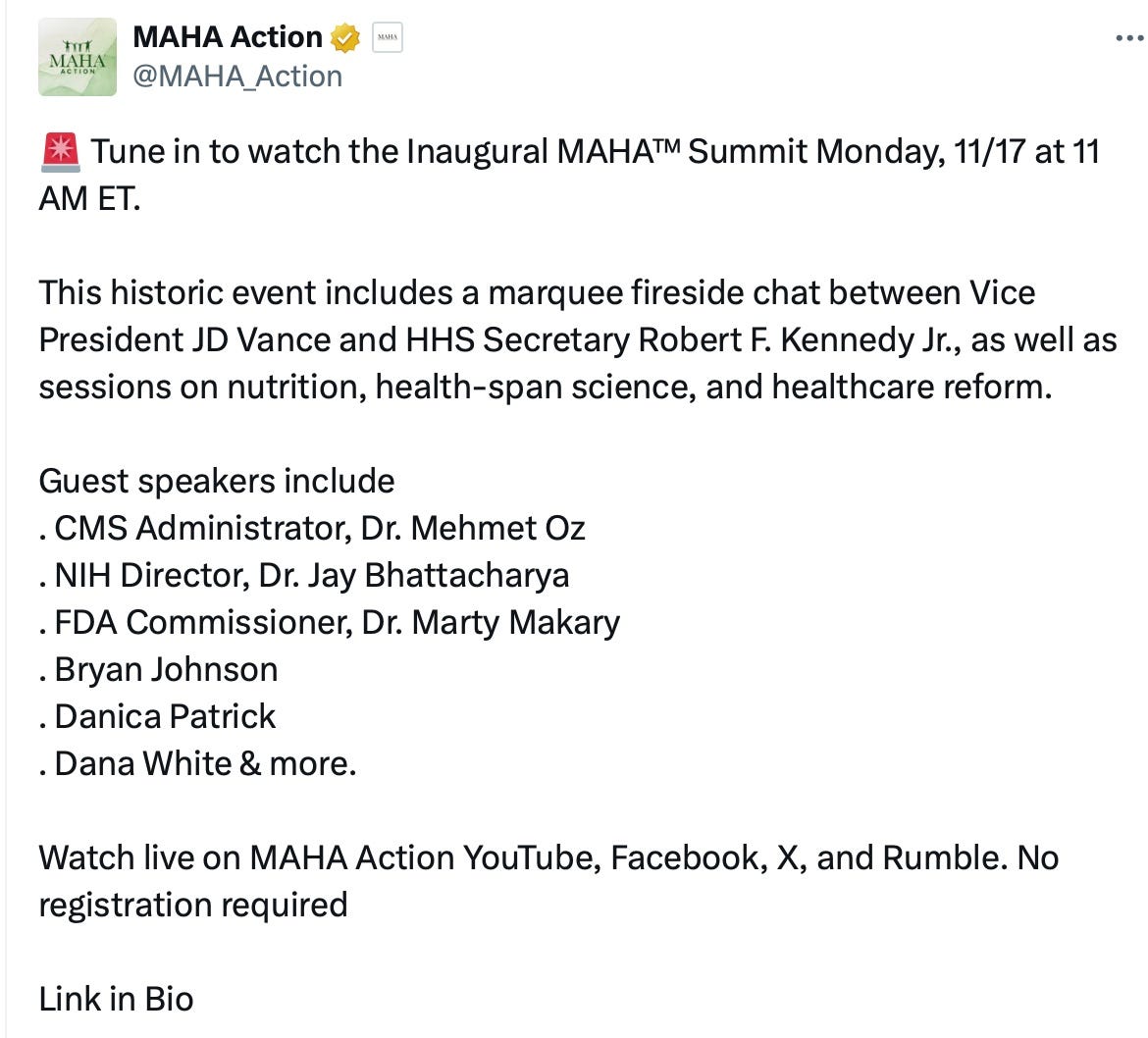 Well, MAHA Action is broadcasting the MAHA Summit event tomorrow, Monday, Nov. 17, at 11 am ET, and so I wanted to let readers know in case they wish to tune in. The problem is that there is no link provided. And “Link in bio” does not mean anything to me. Hopefully you can find a link tomorrow under the MAHA Action twitter handle.