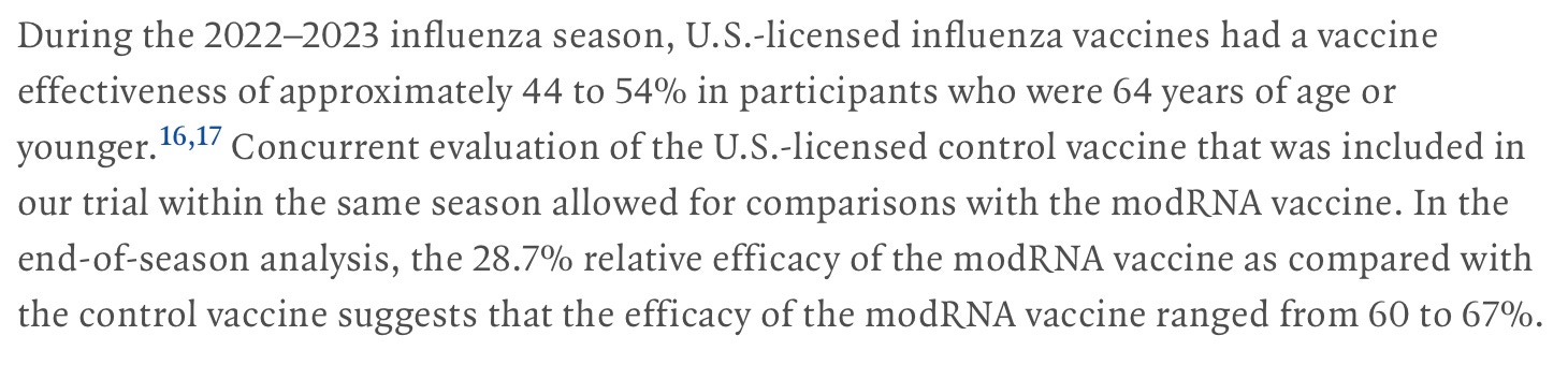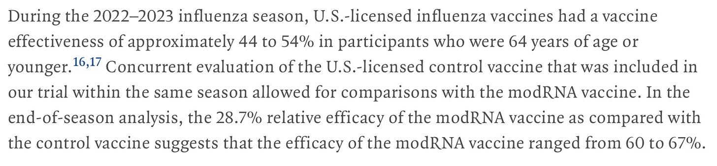 The authors of the study appear to have lied about the efficacy of the comparator vaccine—see what they have claimed, then look at the CDC chart above regarding flu shot efficacy in 2022-23: instead of 30% efficacy, they claim efficacy was 44-54%, and since their modRNA vaccine was 35% better, it had the amazing efficacy for a flu shot of 60-67%.