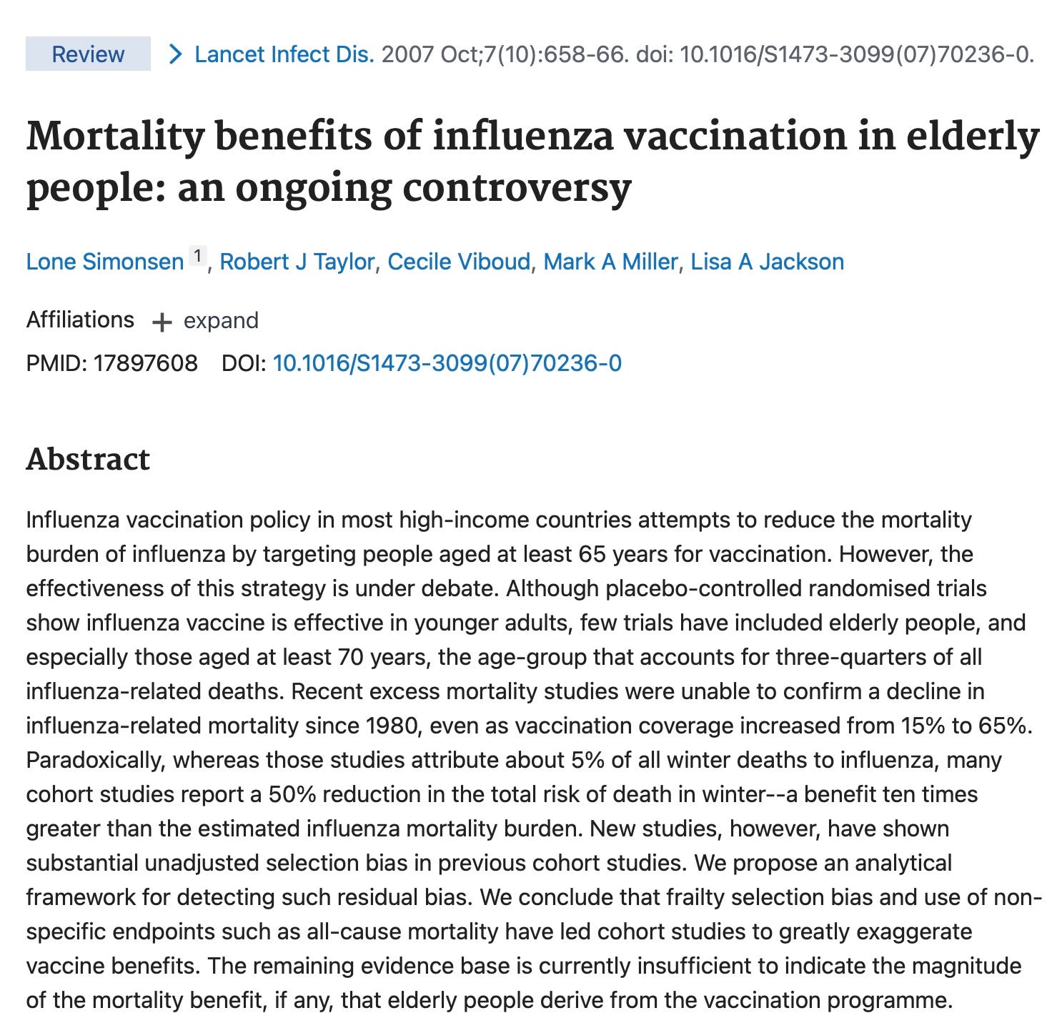 Lisa Jackson, the third author of this paper, appears to have forgotten what she acknowledged in 2008 (see below), which was that it was very controversial whether flu shots worked to prevent flu deaths at all in the elderly. Yet this is the justification for the flu shot program each year, in which CDC invests billions of taxpayer dollars. So why are we giving out these shots at all? What is the real payoff of flu shots? Is it just to get us to line up yearly for a protective shot—to make this part of our culture? To get us ready (soften us up) for the mRNA jabs?