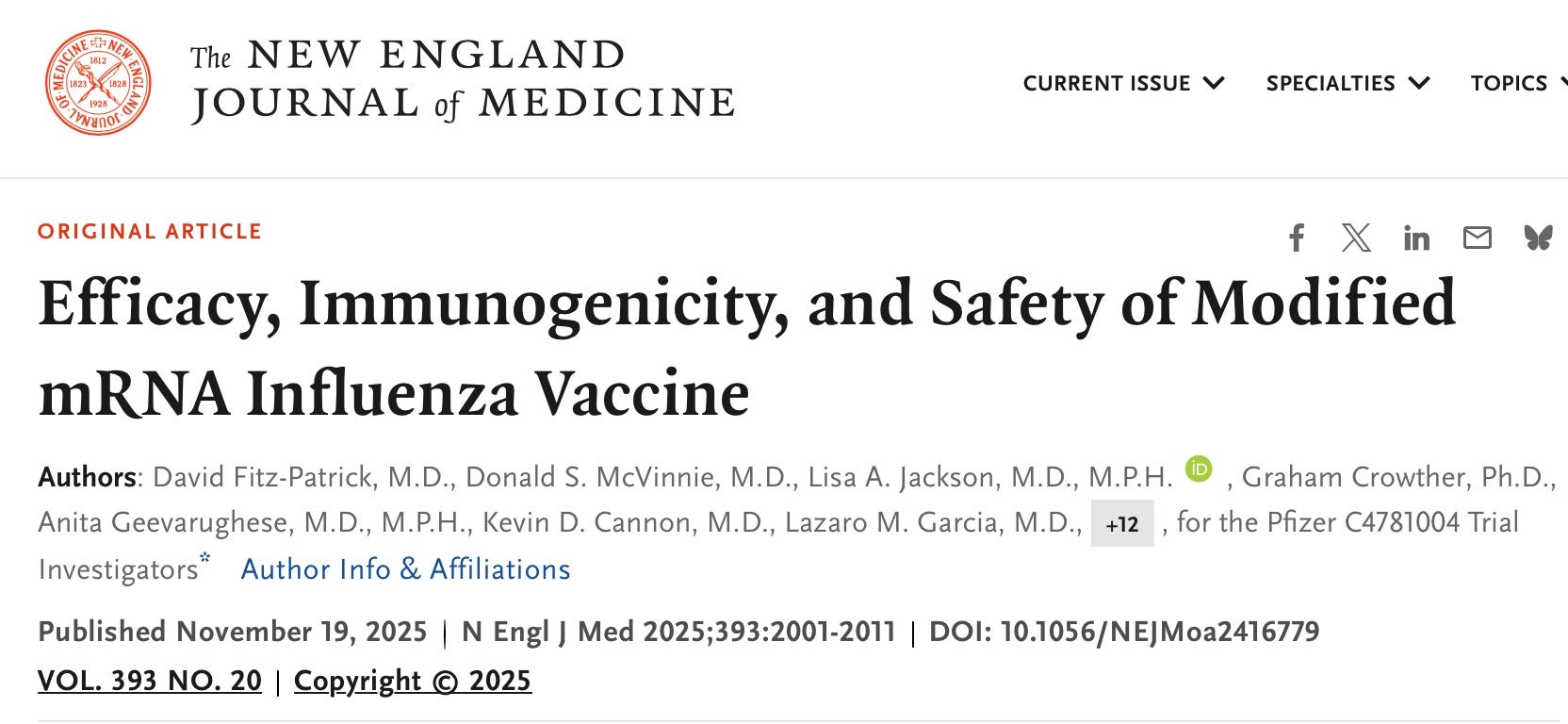 Pfizer trial of modRNA (the new name, which acknowledges the modified uridine in mRNA vaccines) FLU SHOT published in the NEJM today