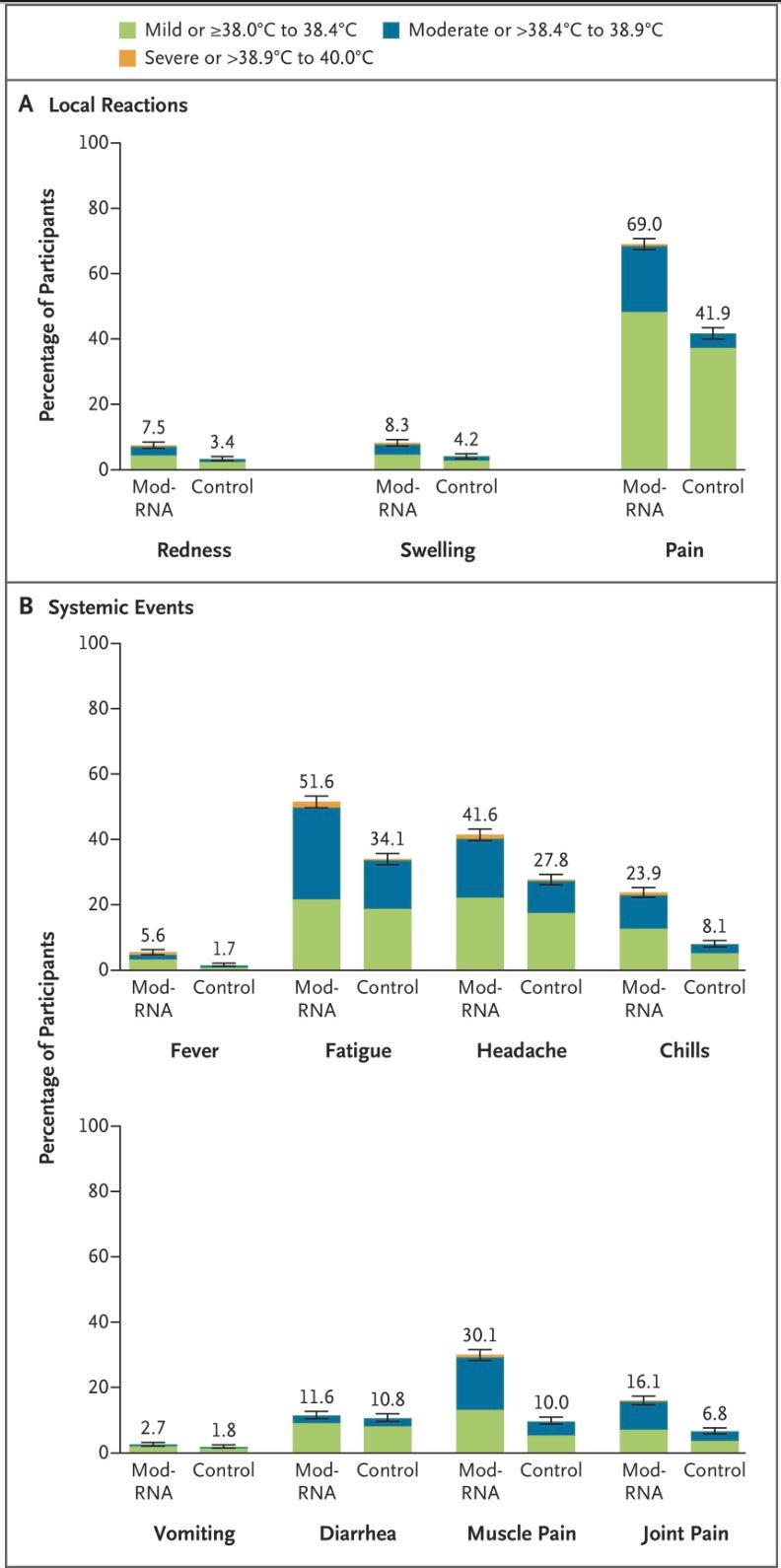 Among 6127 participants in the reactogenicity electronic-diary subgroup, recipients of the modRNA vaccine reported more local reactions and systemic events than control recipients (70.1% vs. 43.1% for local reactions and 65.8% vs. 48.7% for systemic events) (Figure 5 and Table S8).