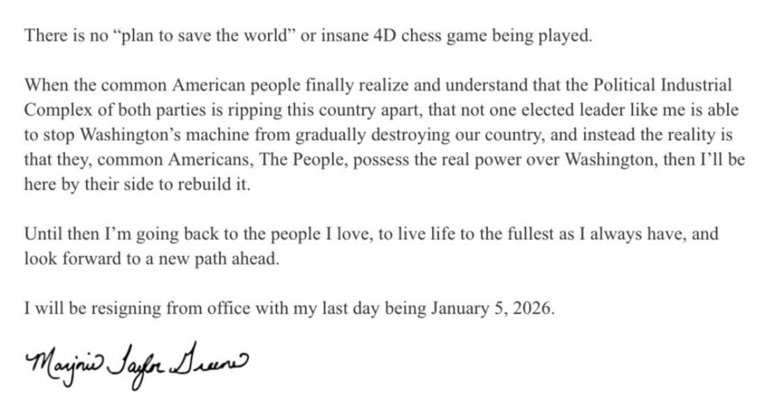 To watch her say it go here (CORRECTED LINK) : https://x.com/mtgreenee/status/1992035608387039359