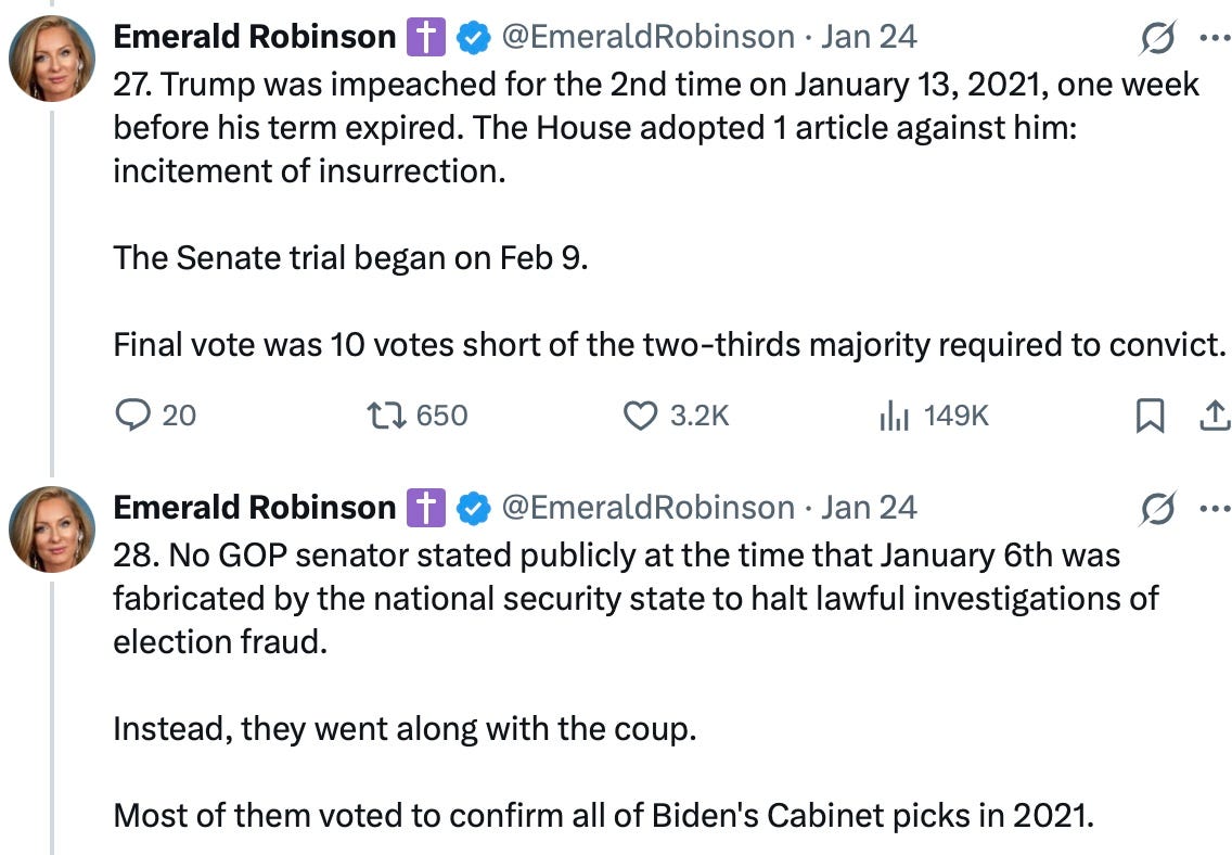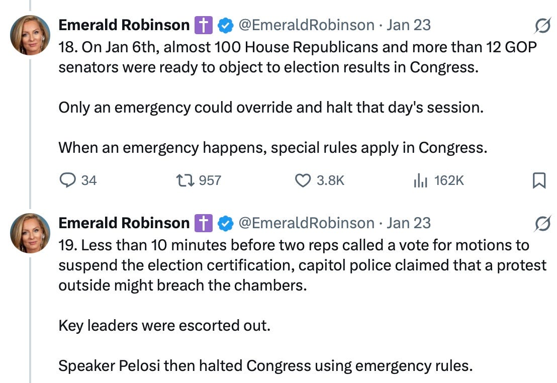 Emerald Robinson points out what struck me at the time, but had forgotten. How most of the Republican members who were going to challenge the election results quickly caved, once the Jan. 6 fake eruption happened, enabling the real coup that eviscerated the challenge to the election results by Republicans in Congress that day.