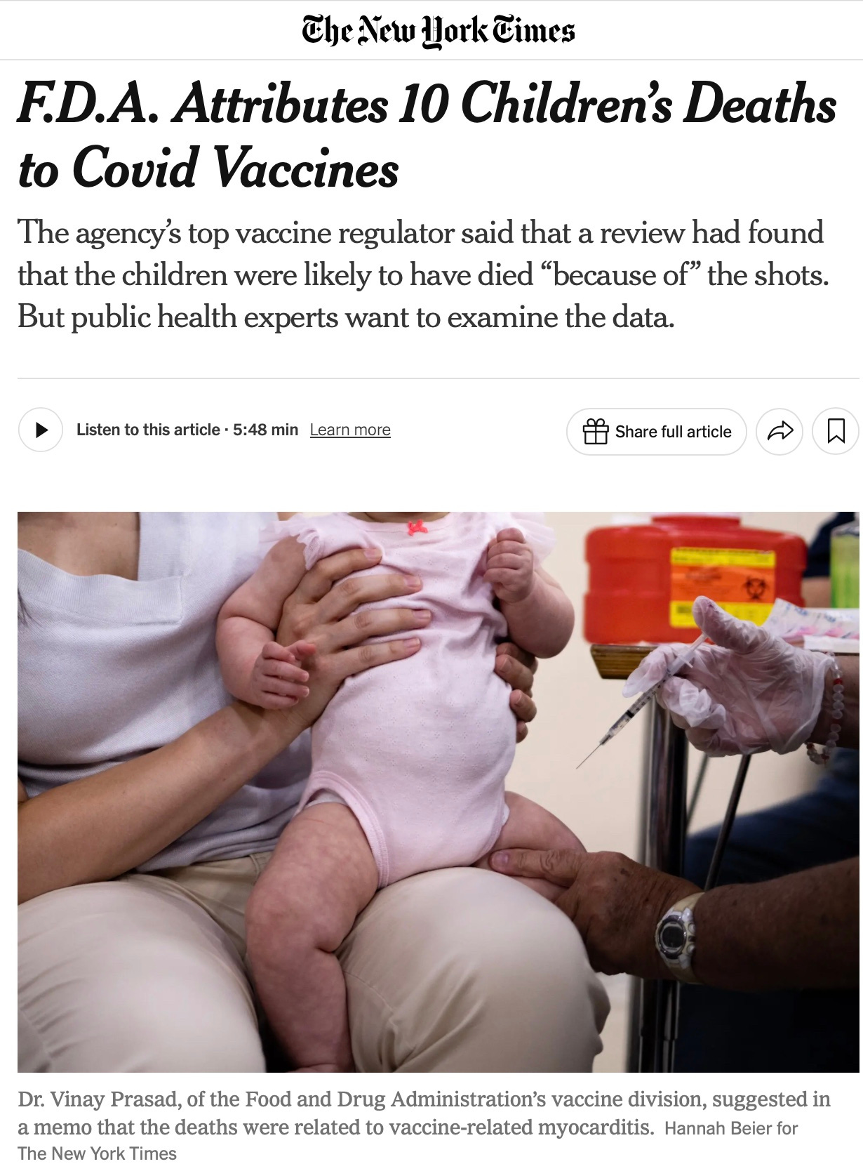 “This is a profound revelation,” Dr. Prasad wrote in a memo to staff members. “For the first time, the U.S. F.D.A. will acknowledge that Covid-19 vaccines have killed American children.”